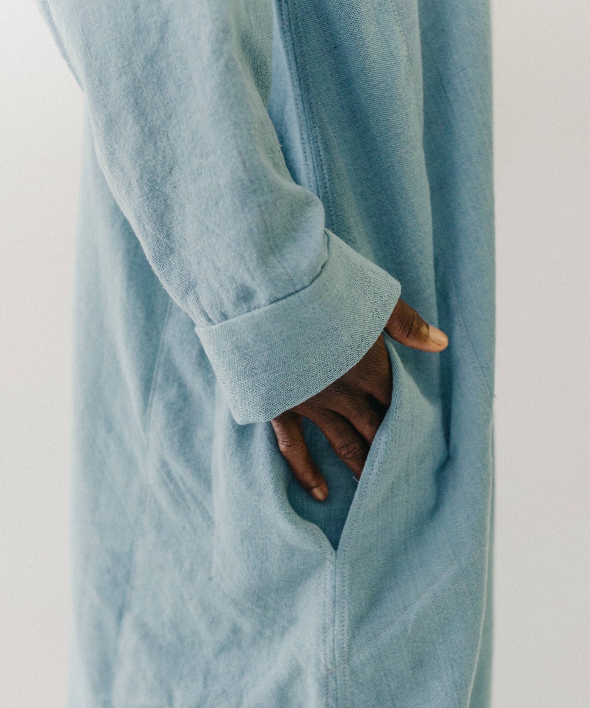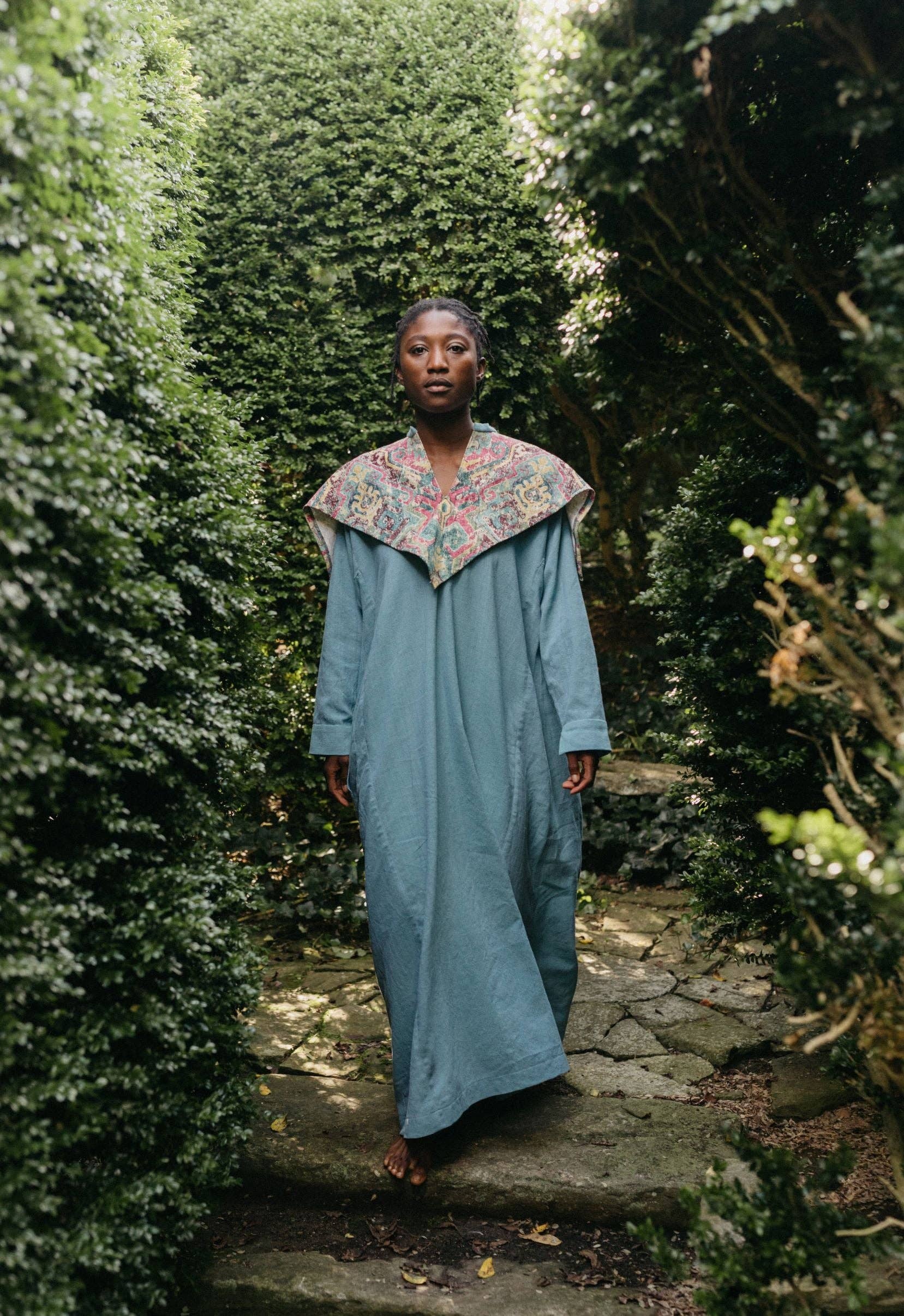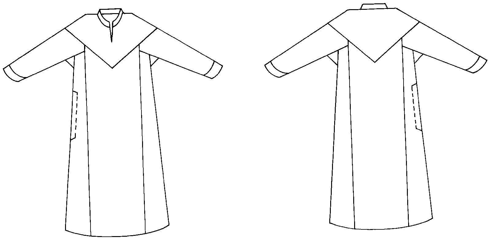 For crossing the deserts of Africa or the urban landscape, this flowing dress is a perfect canvas for needlework or fabric artistry. Typical of Syrian dresses, this garment falls gracefully to the ankles from a large square yoke that forms a triangular effect on the front, back and sleeves. The sleeves are tapered and cuffed. The dress has side panels, underarm gussets, slit-pockets, and a narrow stand-up collar.