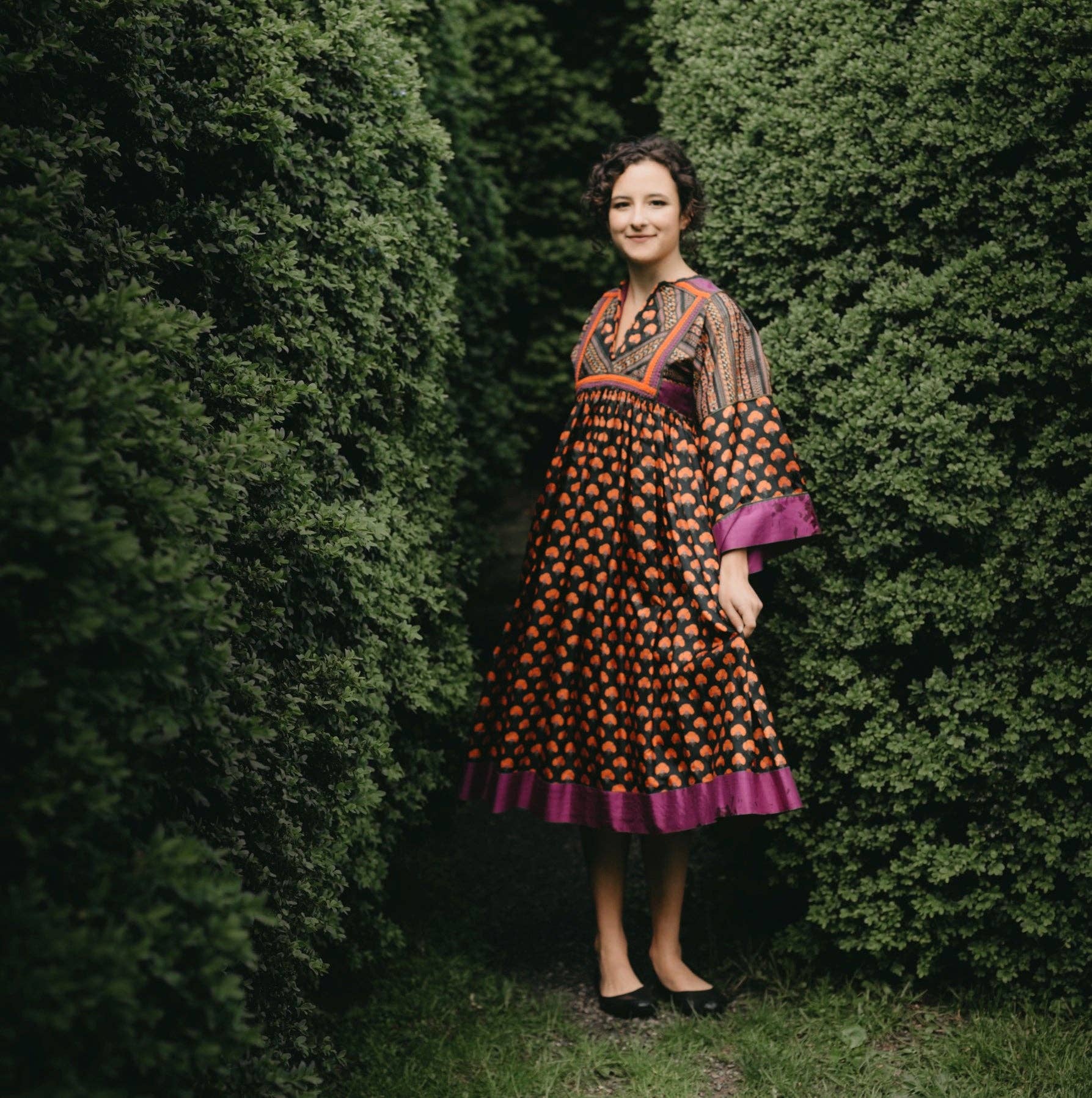 There are three optional bodice embroidery treatments, using chain stitch, mirror cloth, and satin stitch which are all authentic detailing.