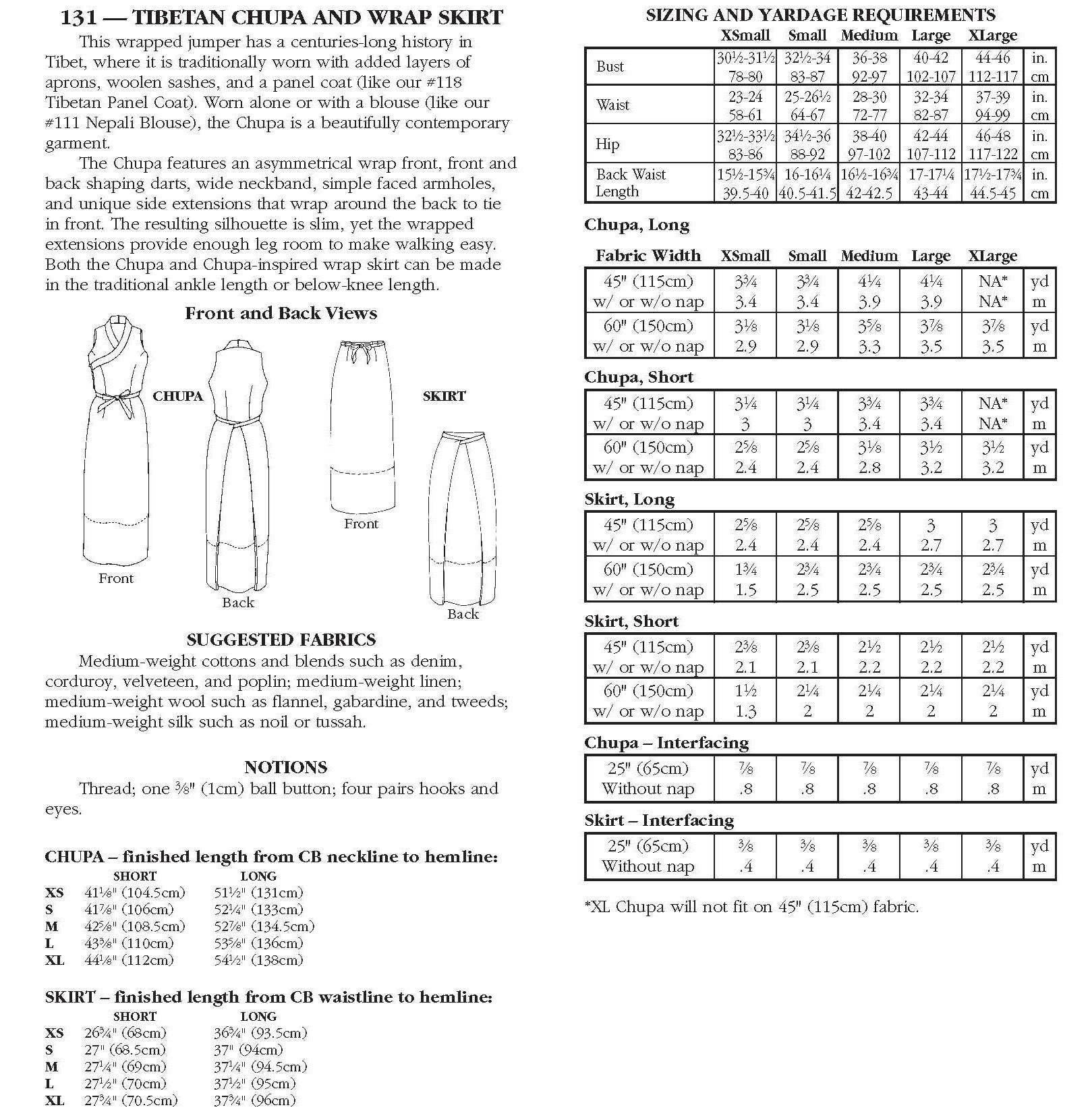 The Chupa features an asymmetrical wrap front, front and back shaping darts, wide neckband, and simple faced armholes, and unique side extensions that wrap around the back to tie in front. The resulting silhouette is slim, yet the extensions enable enough leg room to make walking easier than most wrap skirts. Both the Chupa and Chupa inspired wrap skirt can be made in the traditional ankle length or below the knee length.