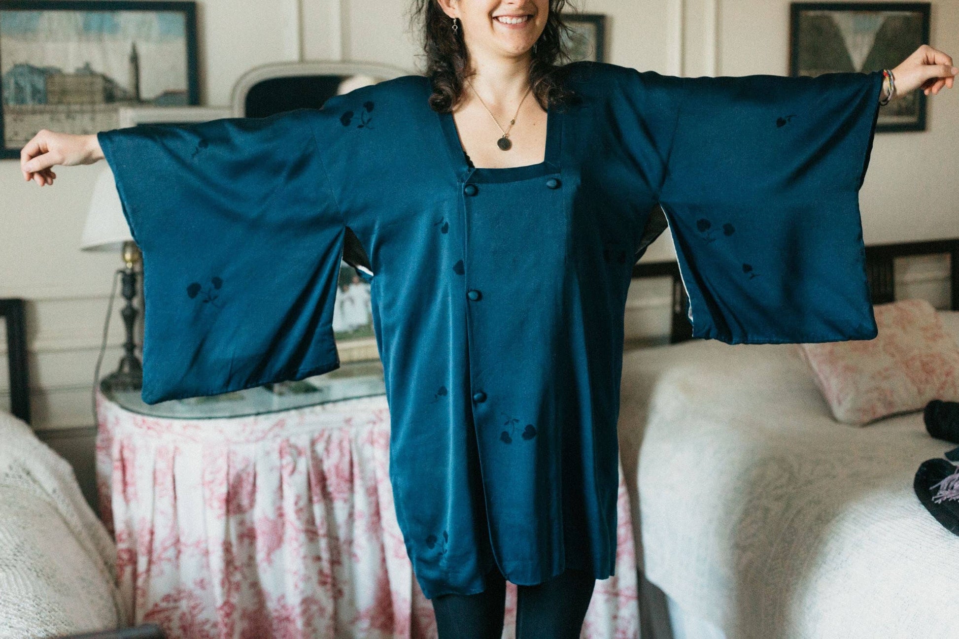 This sewing pattern features a double-breasted front opening, kimono style sleeves that are large enough to fit over a kimono underneath, narrow neck band with mitered corners, and a handy pocket hidden in the front seam.