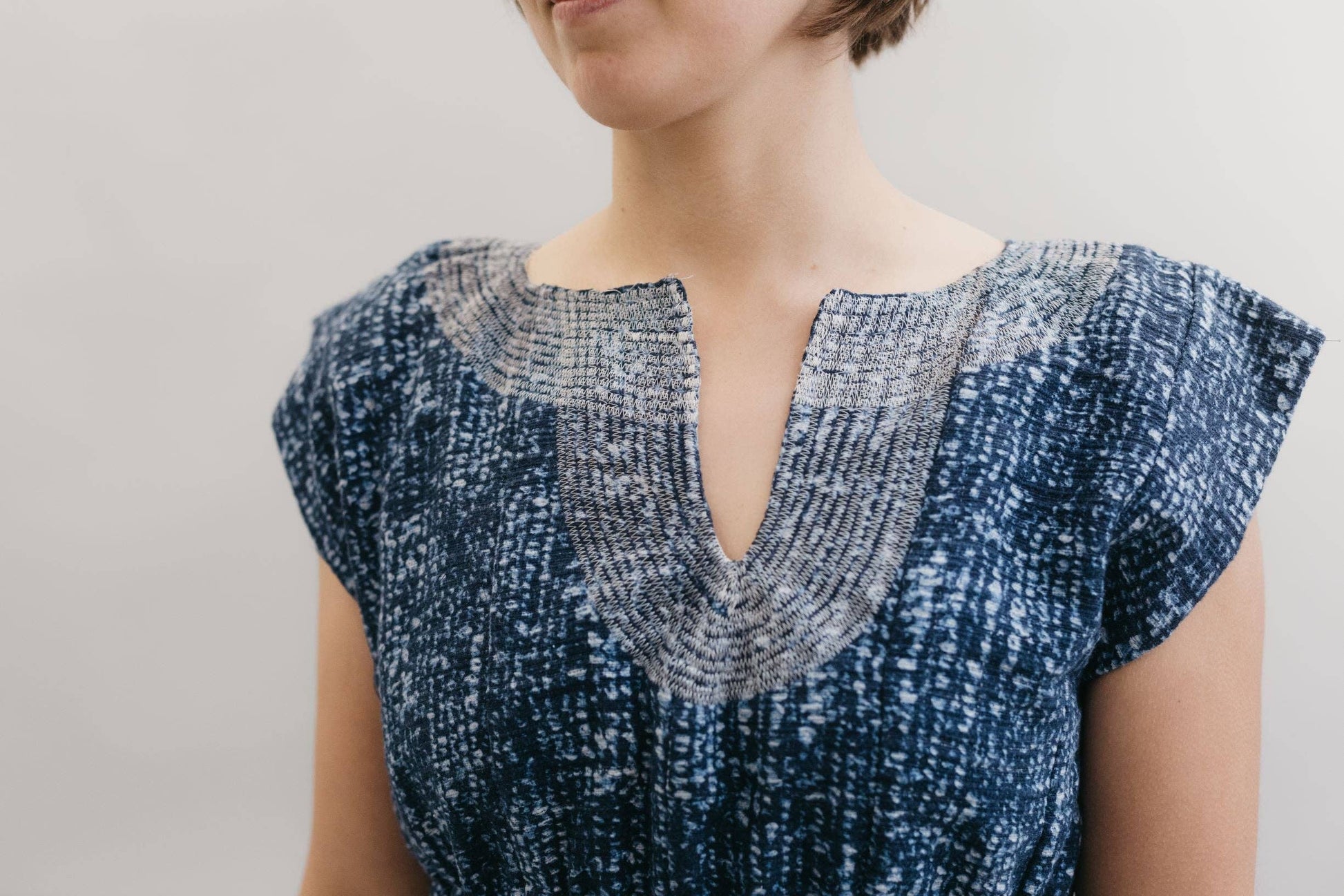 This loose-fitting top originated in northern Ghana, but is now worn in many areas of West Africa, and has become popular around the world. It is called fugu, or batakari, among other terms in Ghana, and is generally made from hand-woven strips of fabric with wedge-shaped godets inserted below the chest to give it a flared shape.