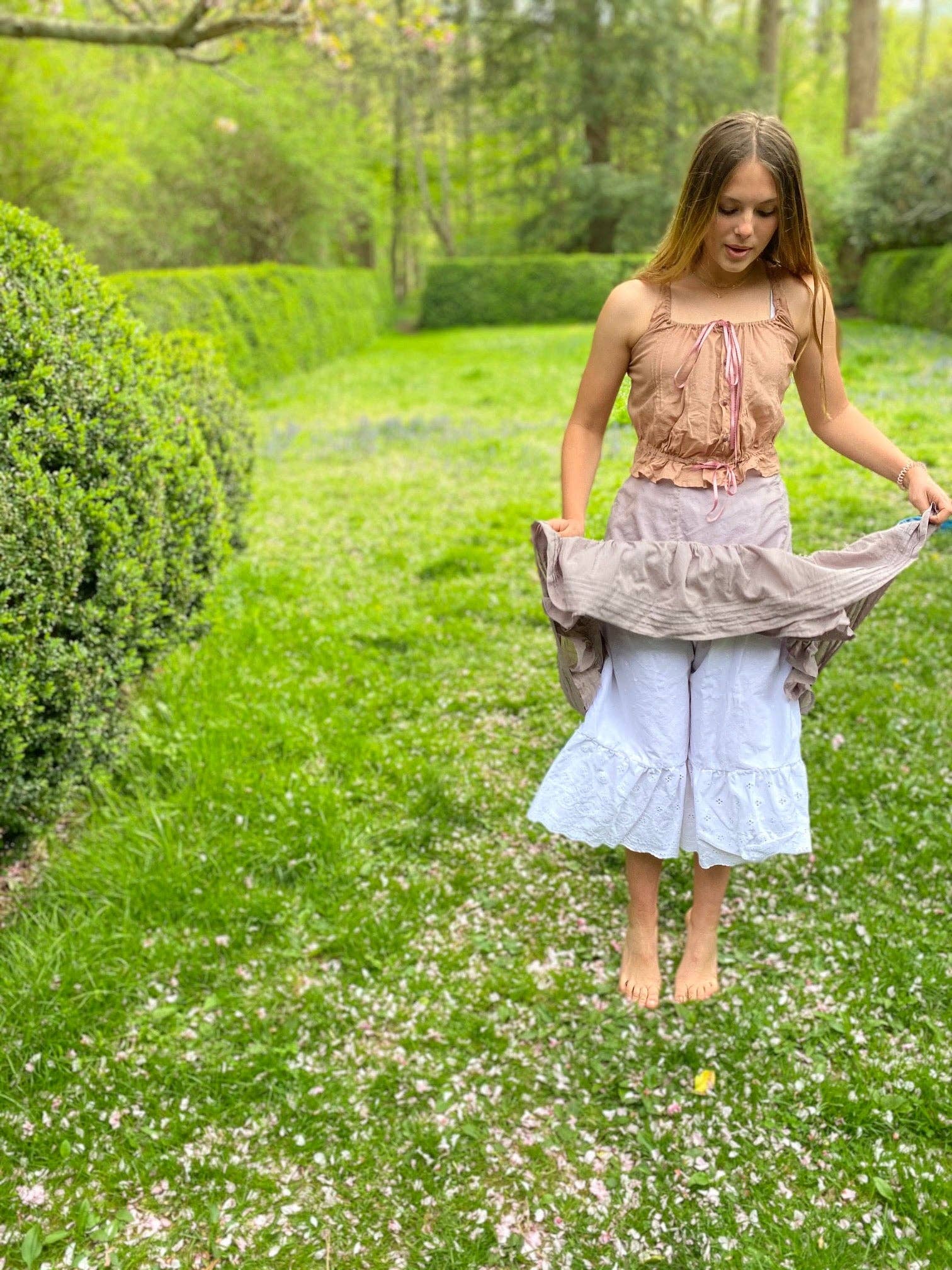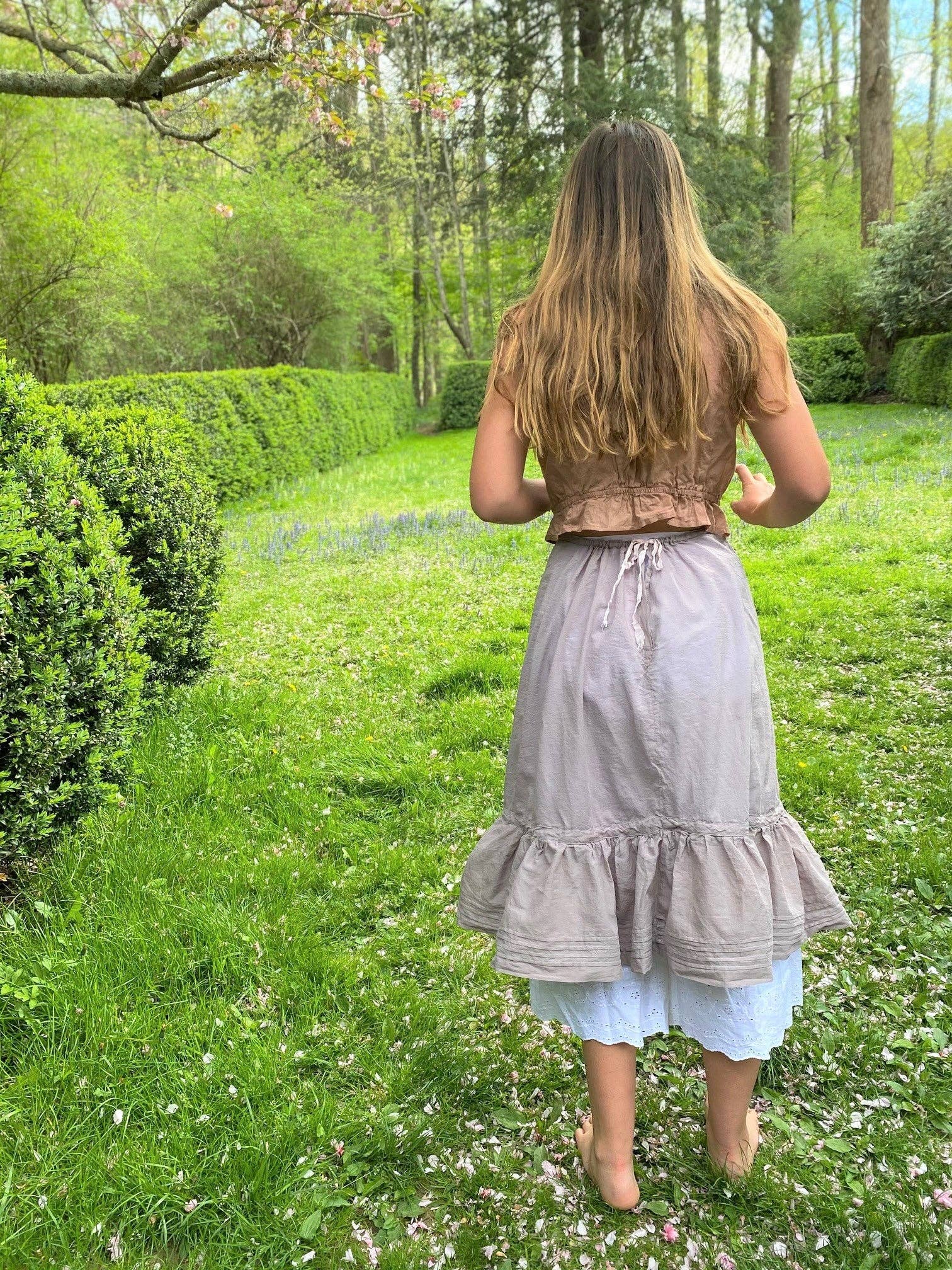 The gored Petticoat falls to a wide flounce over a dust ruffle at the hemline. The drawstring waist ties at a back placket opening.