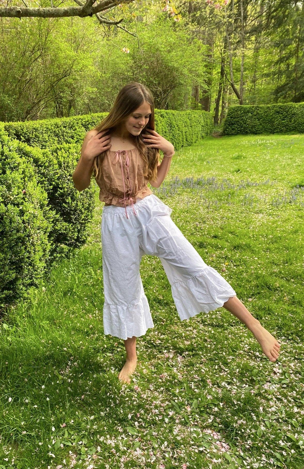 The Camisole's bodice is accentuated by clusters of tucks and optional lace insertions. Slightly high-waisted and fitted in back, it is bloused in front, with soft gathers falling from ribbon beading of lace or eyelet edging. The camisole closes with drawstrings at the neck and waist, and a buttoned front opening.