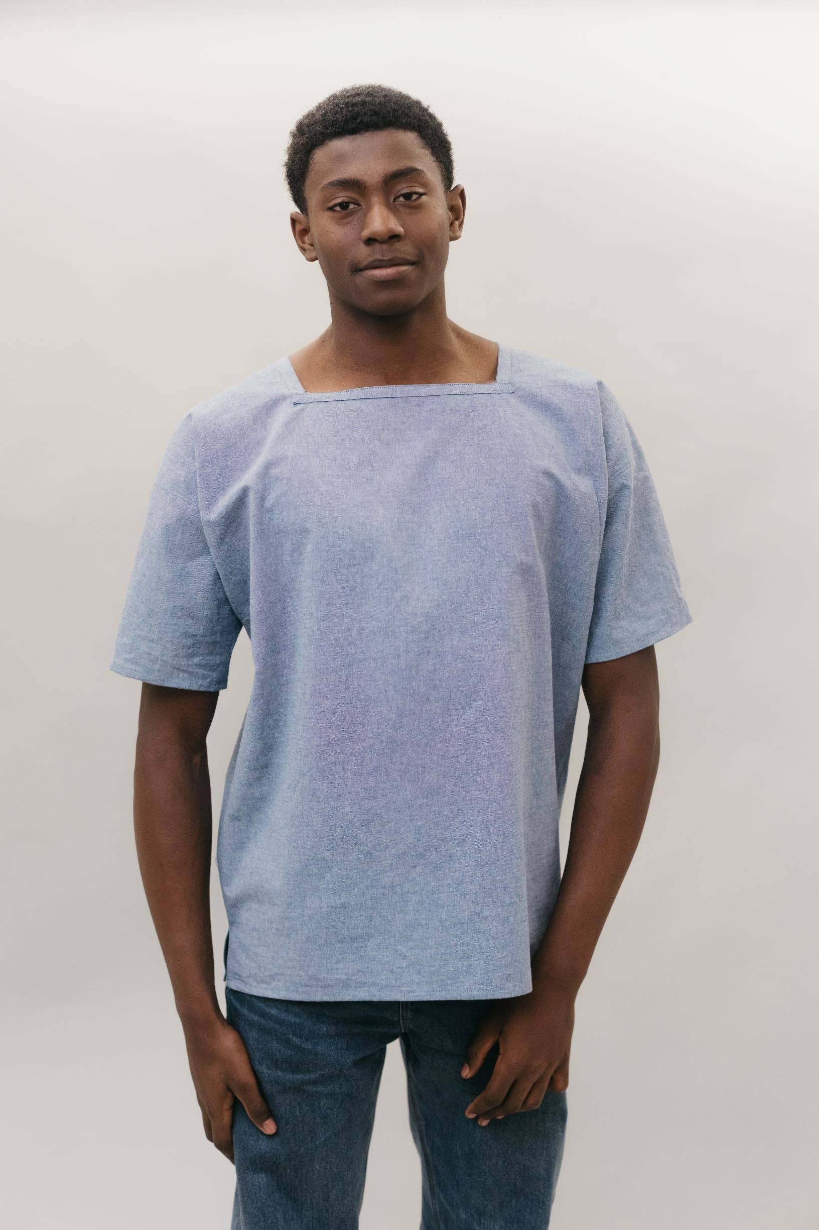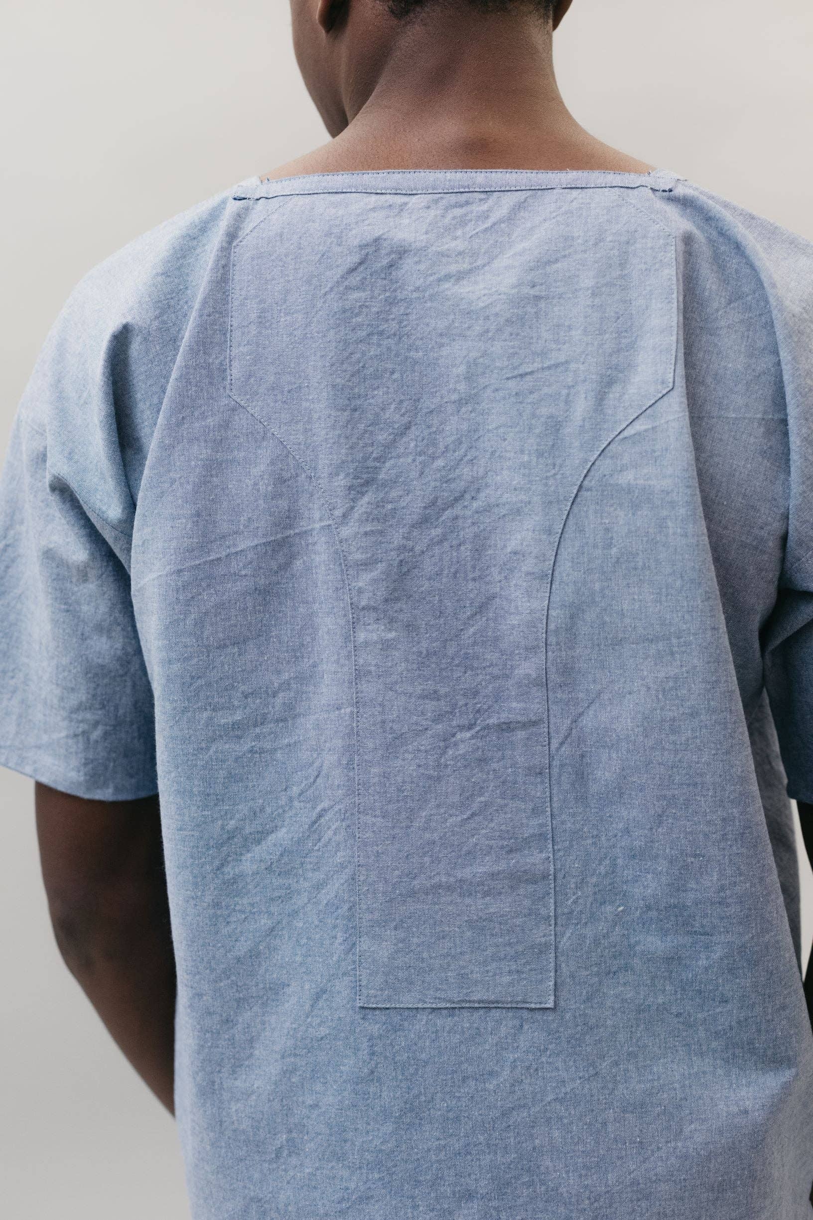 Our View A is a very simple garment worn by British seamen in tropical climes. Traditionally made of a white cotton twill with blue binding around a square neck, the Shirt featured short sleeves and a self-patch in the back.