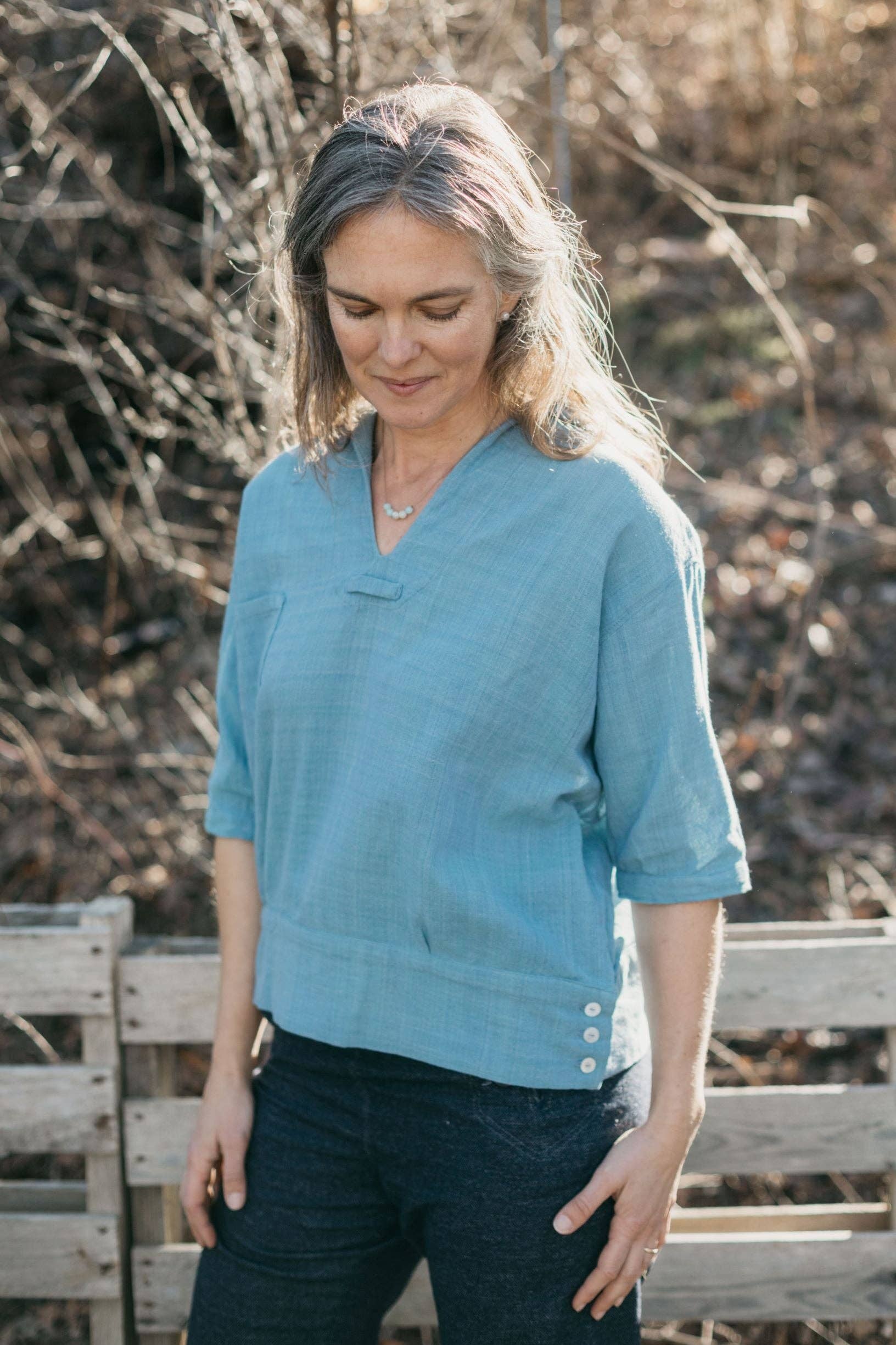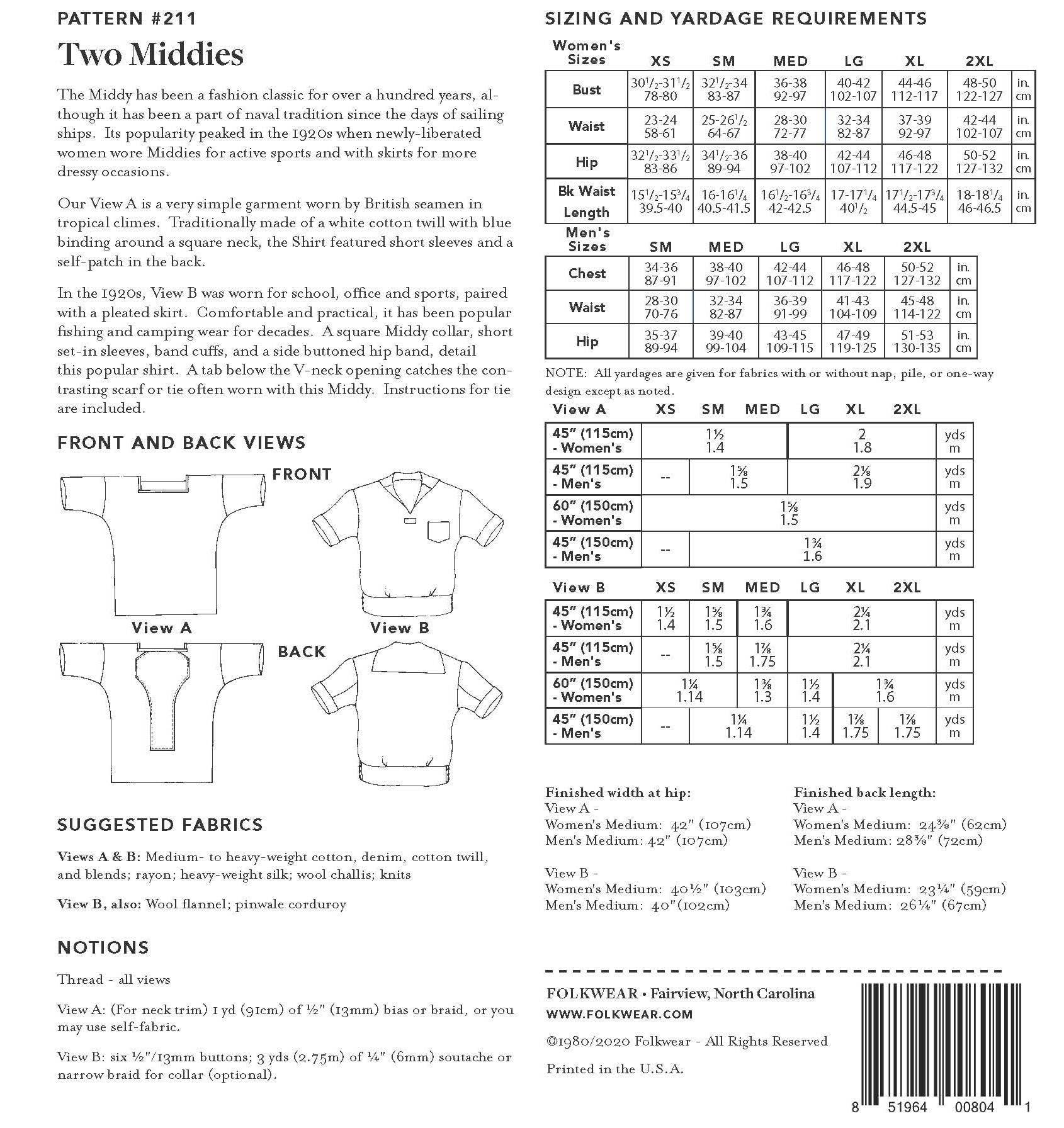 The Middy has been a fashion classic for over a hundred years, although it has been a part of naval tradition since the days of sailing ships. Its popularity peaked in the 1920s when newly-liberated women wore Middies for active sports and with skirts for more dressy occasions. Folkwear offers this sewing pattern with two distinct views.