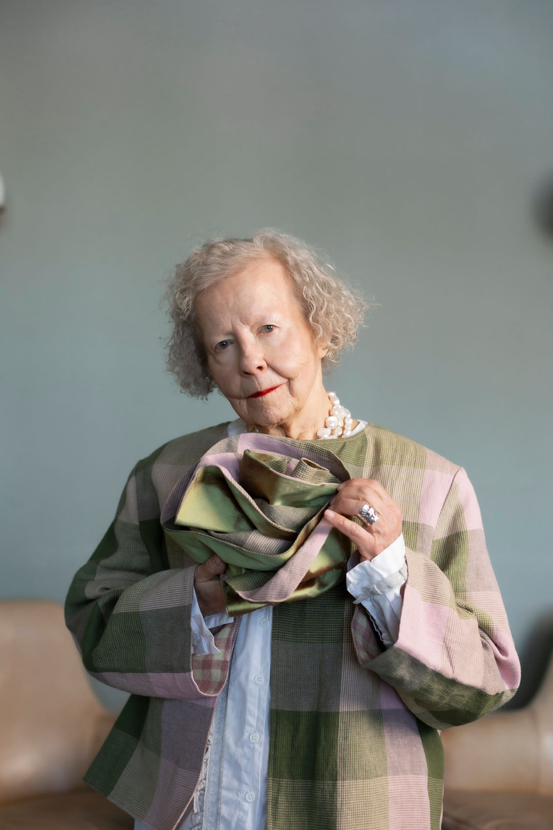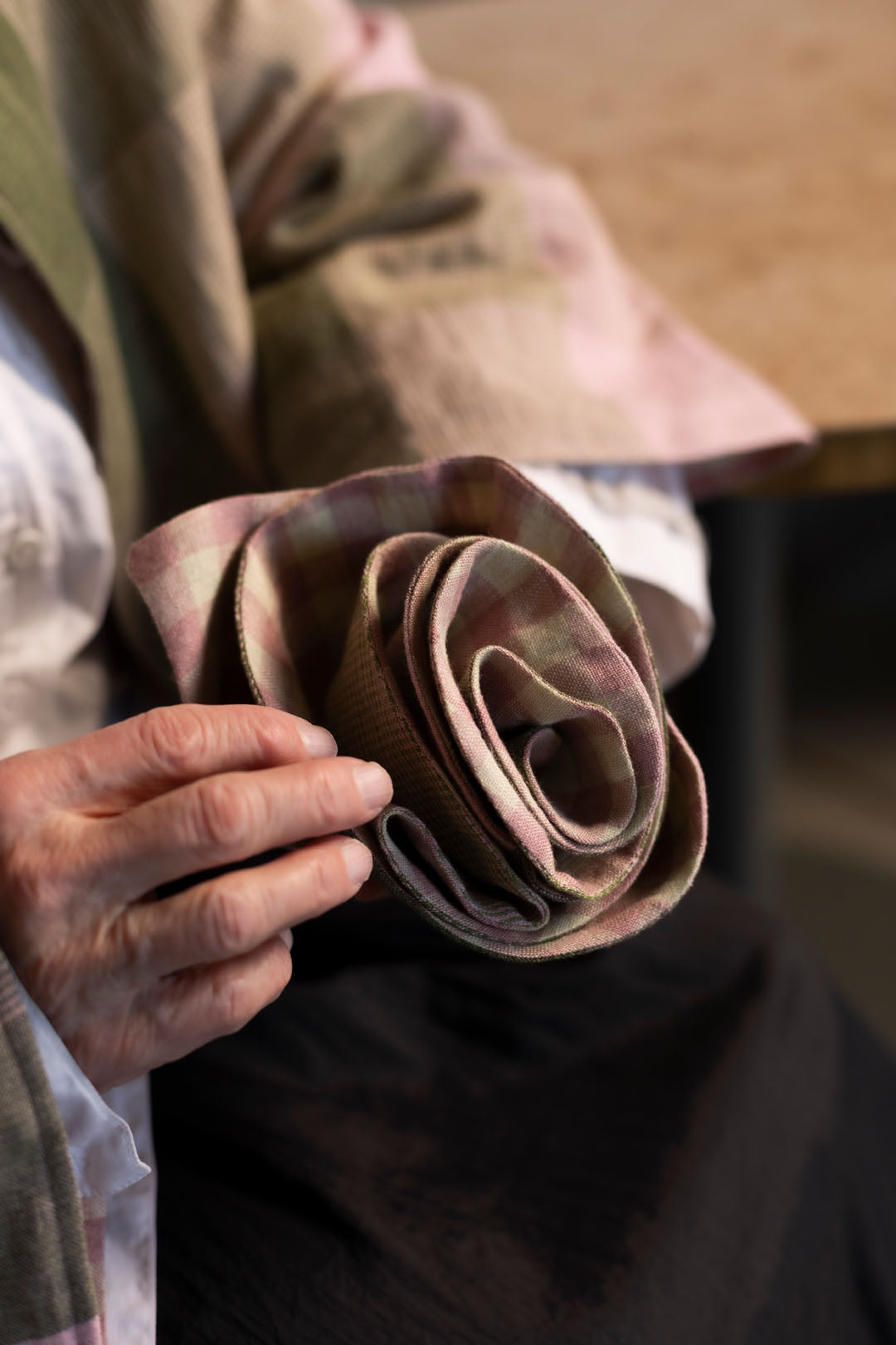 The samples are made from fabric scraps and leftovers such as “Pillar Box 130 European Laundered Linen” (100% linen, 3.8 oz/130 gsm), “Vetiver Check European Laundered Linen/Cotton” (50% linen, 50% cotton, 4.7 oz/161 gsm), “Nougat European Laundered Linen Gingham” (100% linen, 5.9 oz/200 gsm) by Merchant & Mills, and “Ikat Pochampally” (100% cotton, 3.5 oz/120 gsm) by Karlotta Pink.