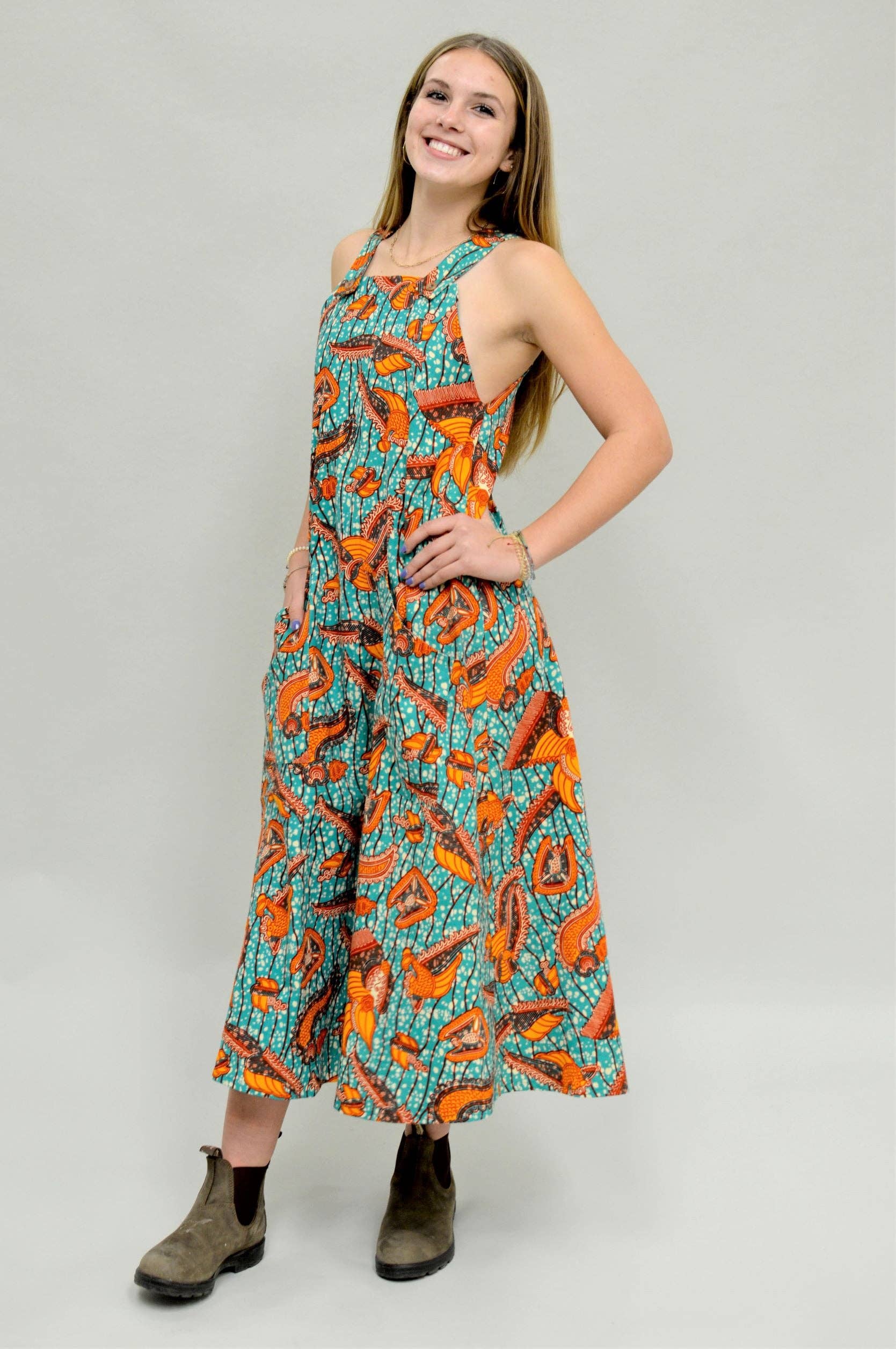 Sizes XS-3XL The apron, or pinafore, is one of humanity's oldest garment forms. Whether worn to cover and protect the body or to mark status, garments that covered the front of the torso and lap are seen in Neolithic art and Renaissance paintings. Our Pinafore dress is both a covering and a garment, with helpful pockets added in. This easy-to-sew pattern for a low-calf-length pinafore dress features two patch pockets with pocket bands and wide straps that button in front. A perfect everyday dress that can be worn in any season, it is practical and simple.  Wear over a shirt and leggings for winter, or on its own or with a tank top for summer.  This makes a great lounge dress, work/garden smock, or comfortable dress to wear out and about.