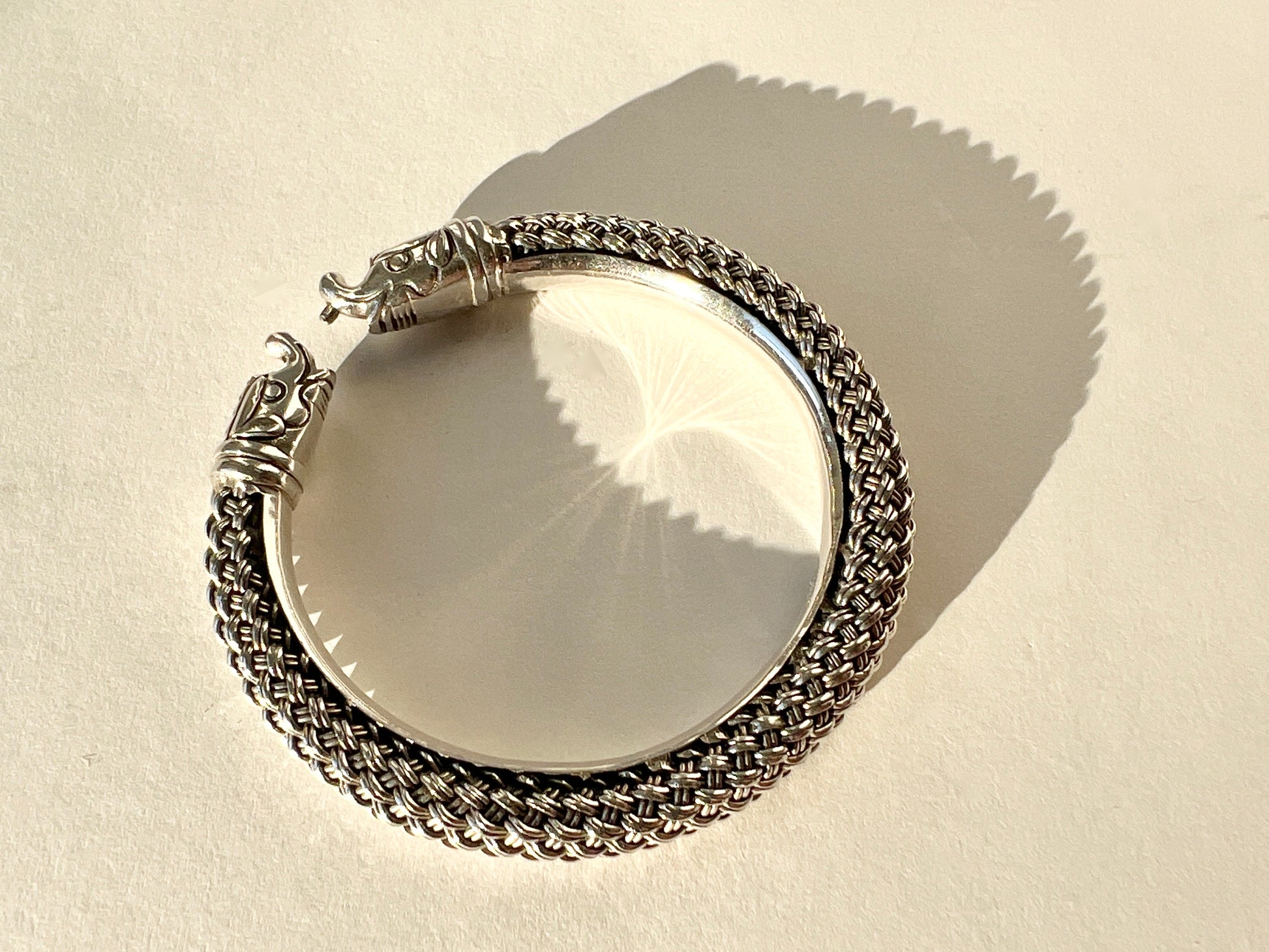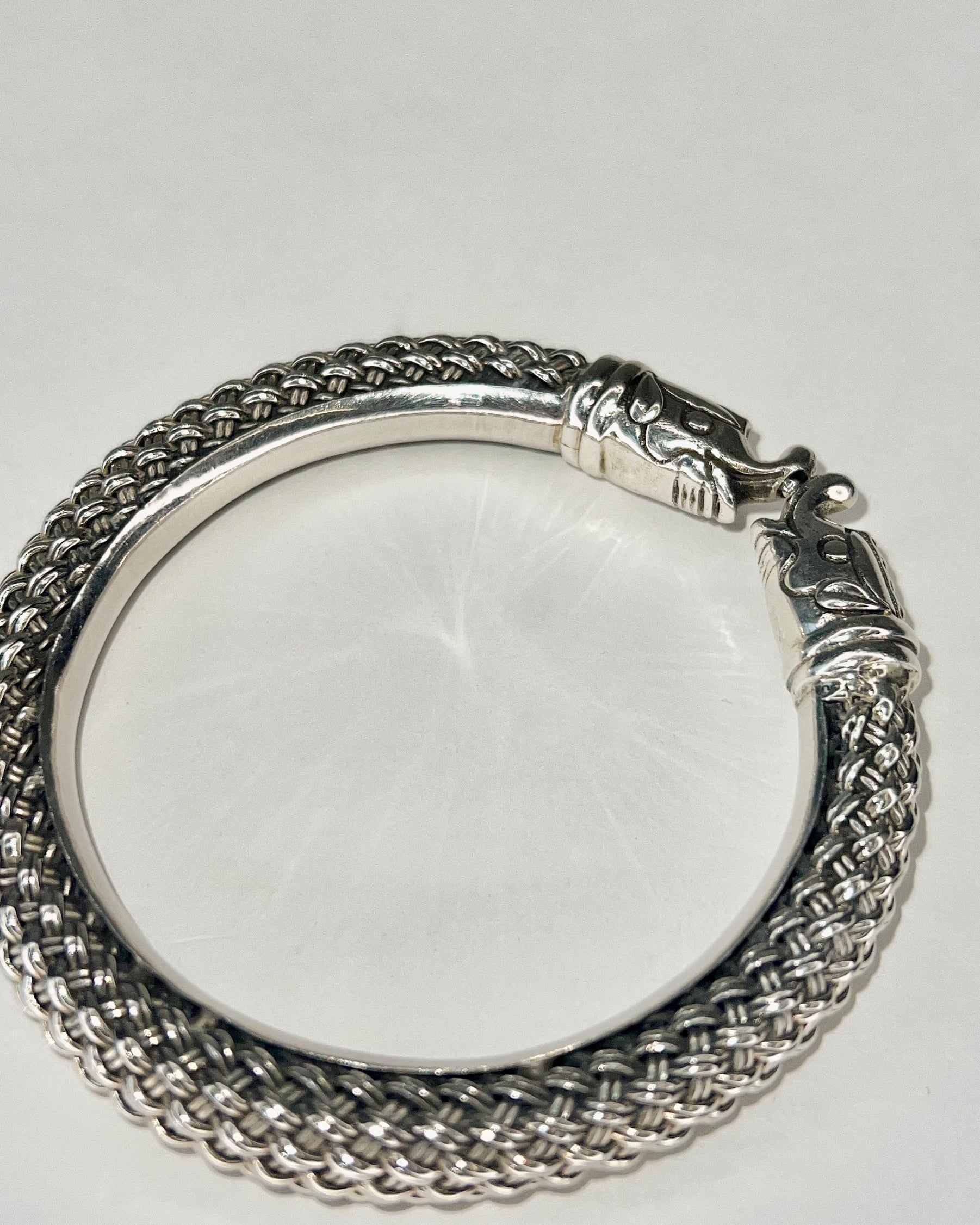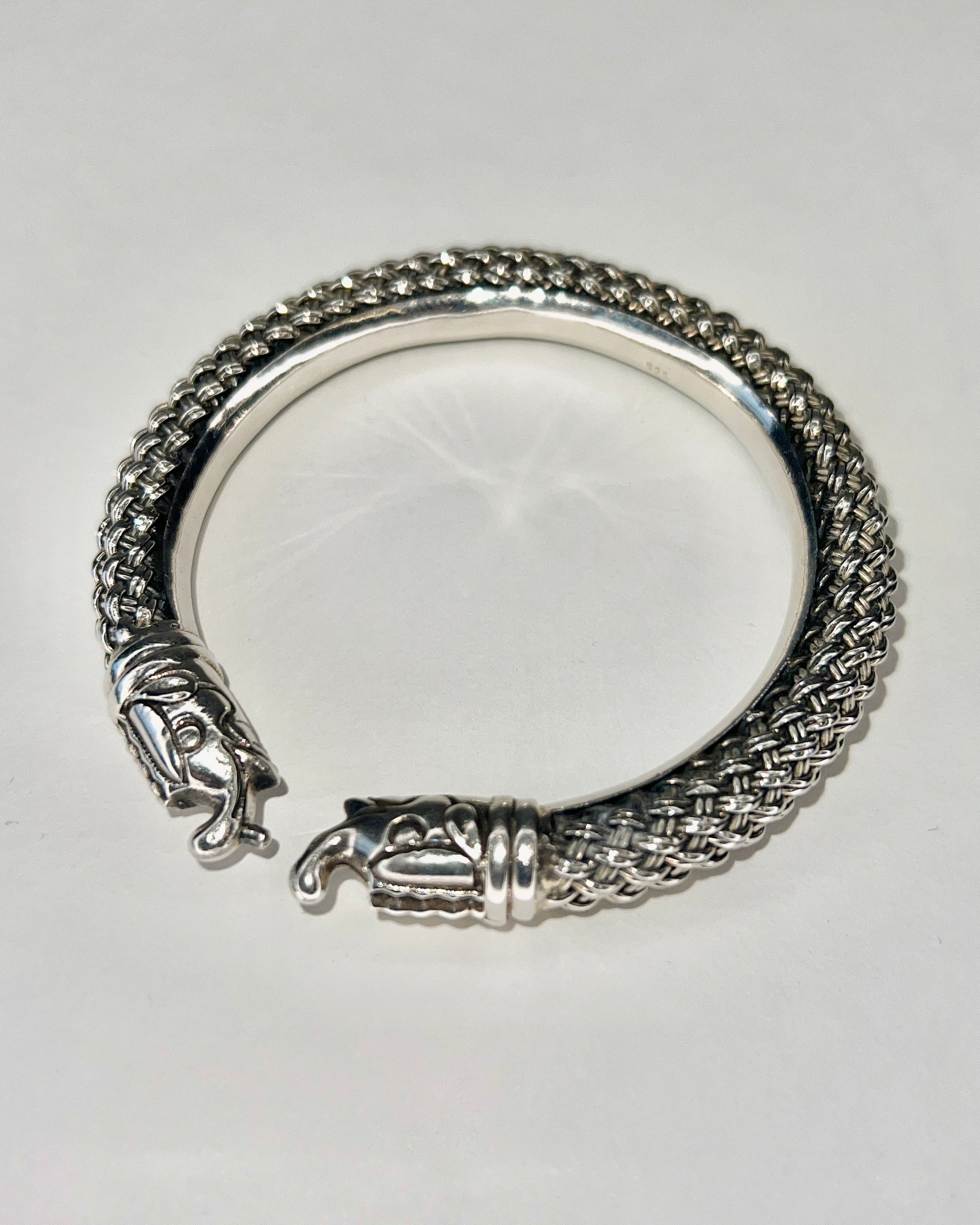 vintage heavy braided silver wire bangle with cast elephant tension pin closure, from Chandni Chowk Market in New Delhi.