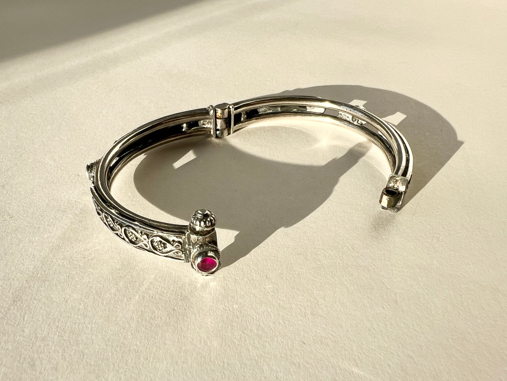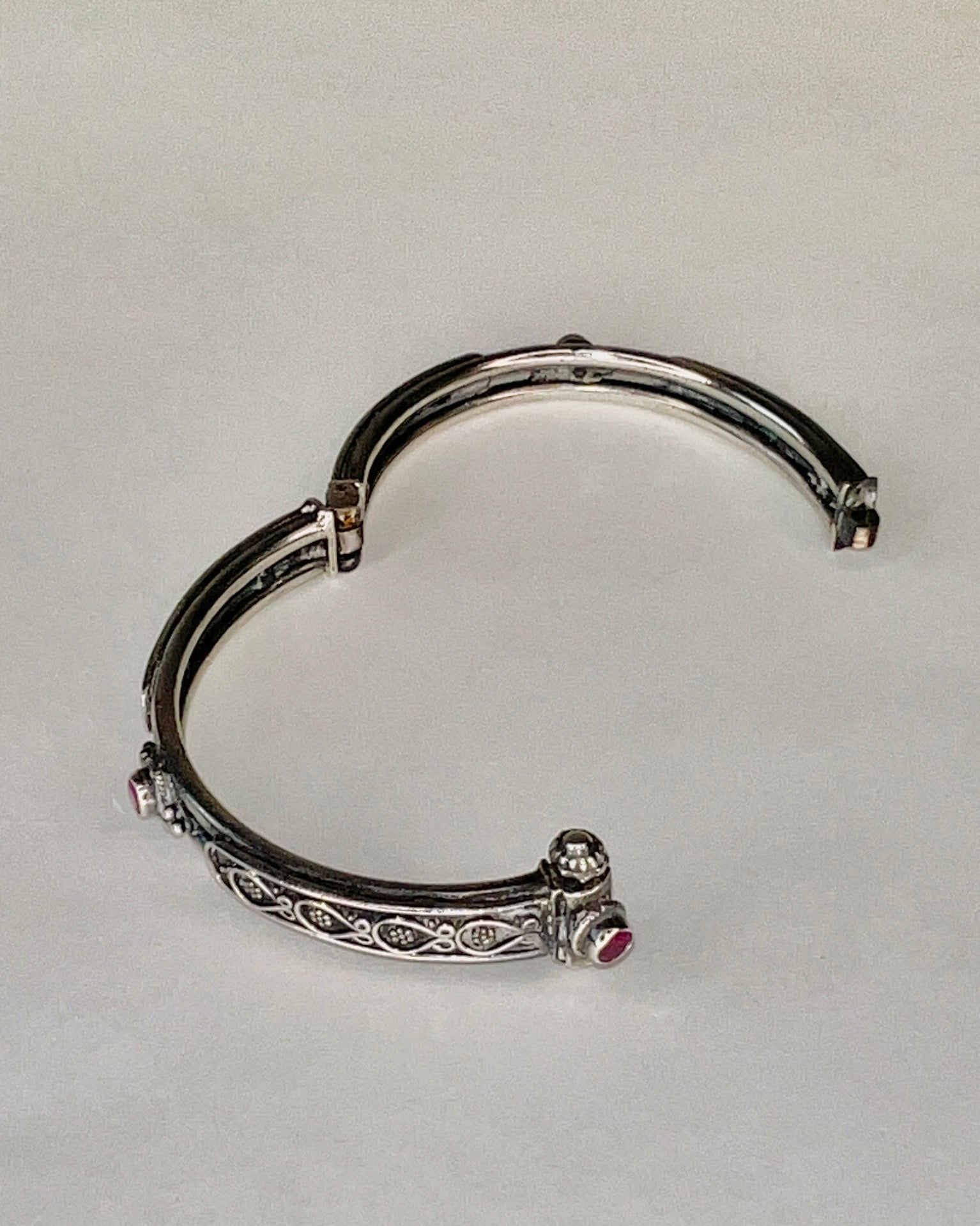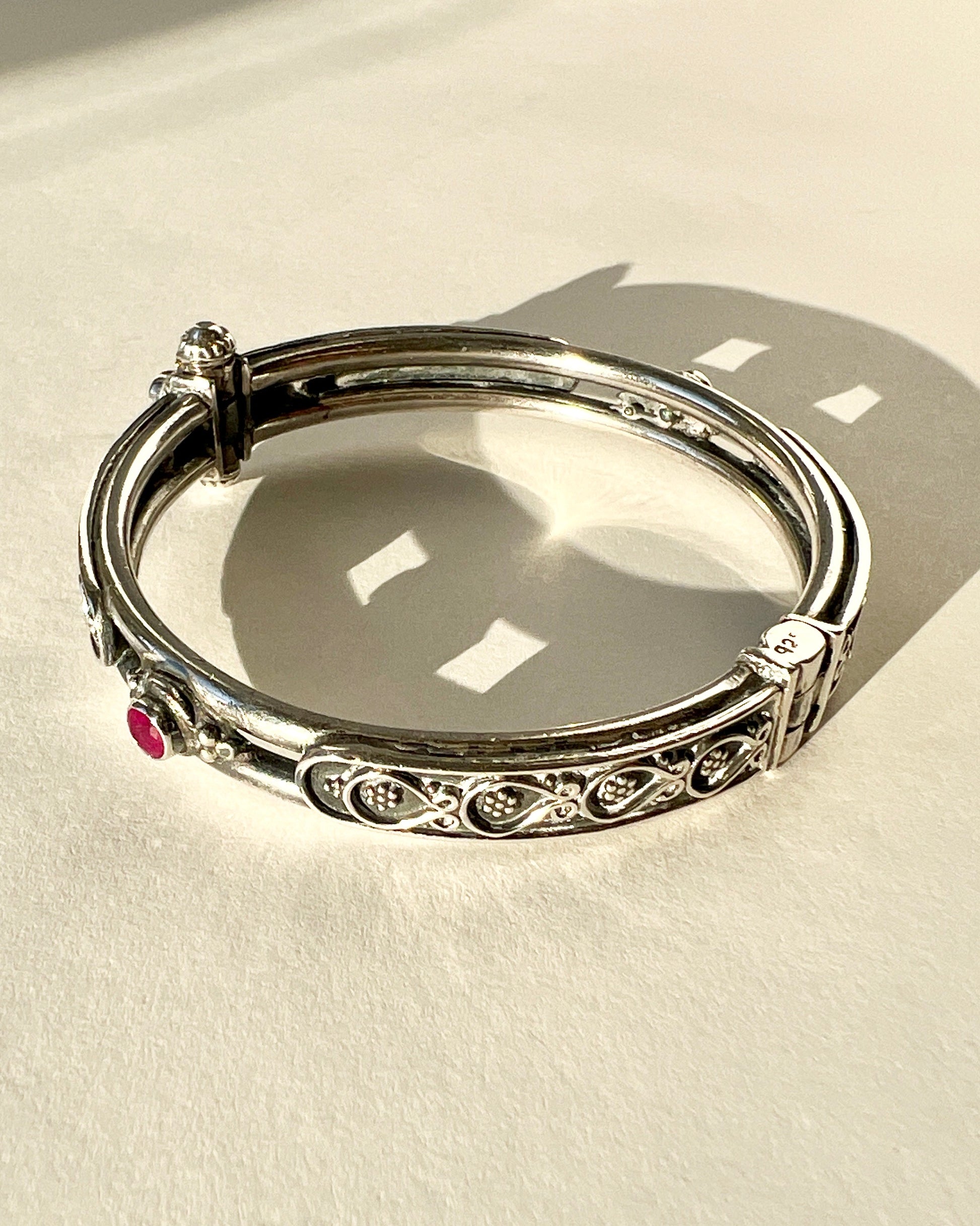 vintage silver hinged bangle with floral design, three rubies, and pin closure. Found in Chandni Chowk Market, New Delhi.