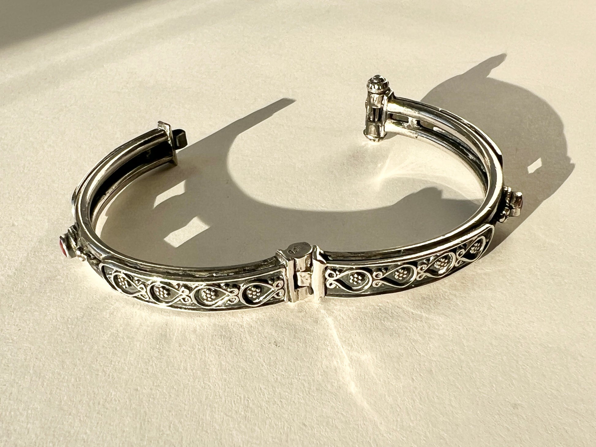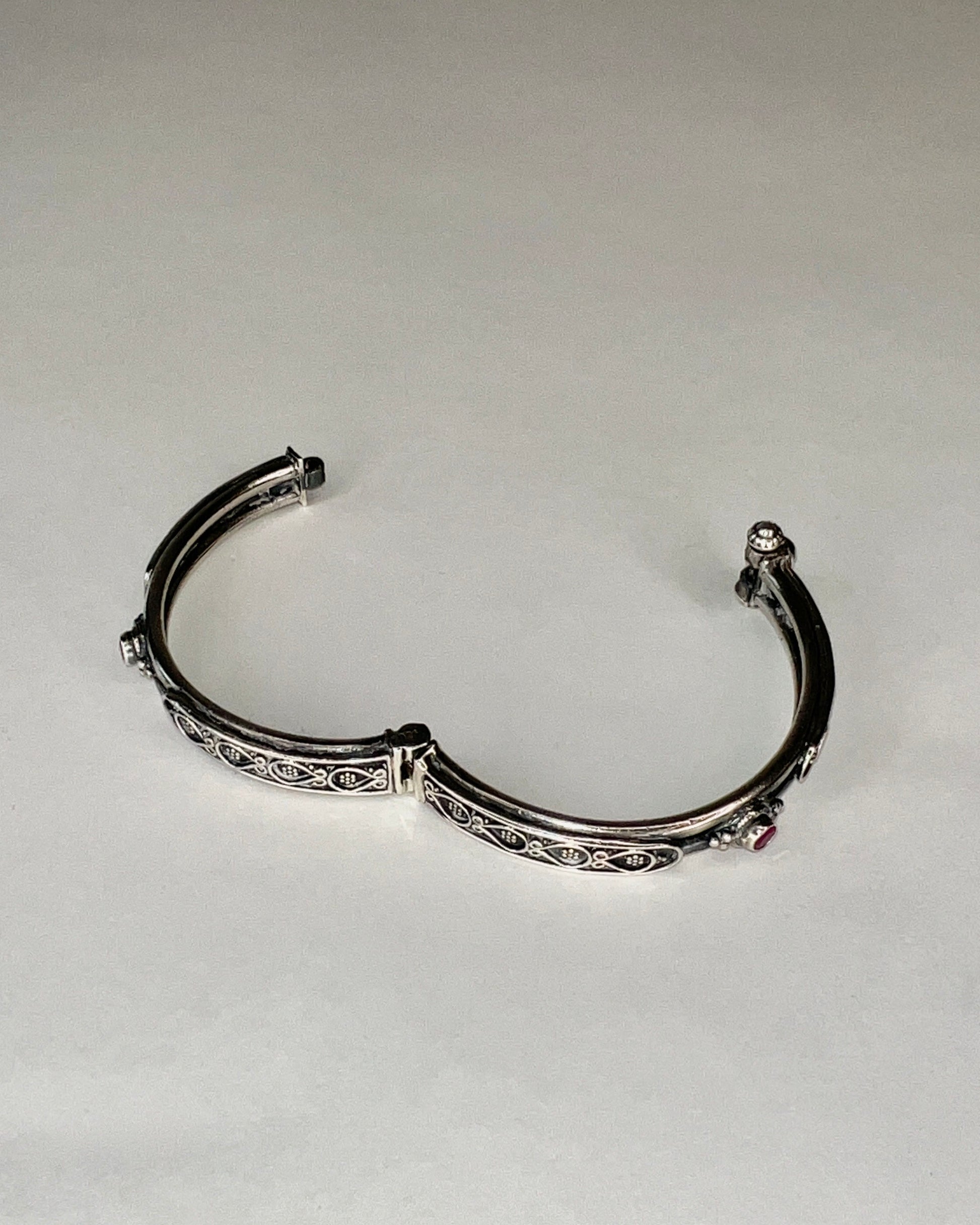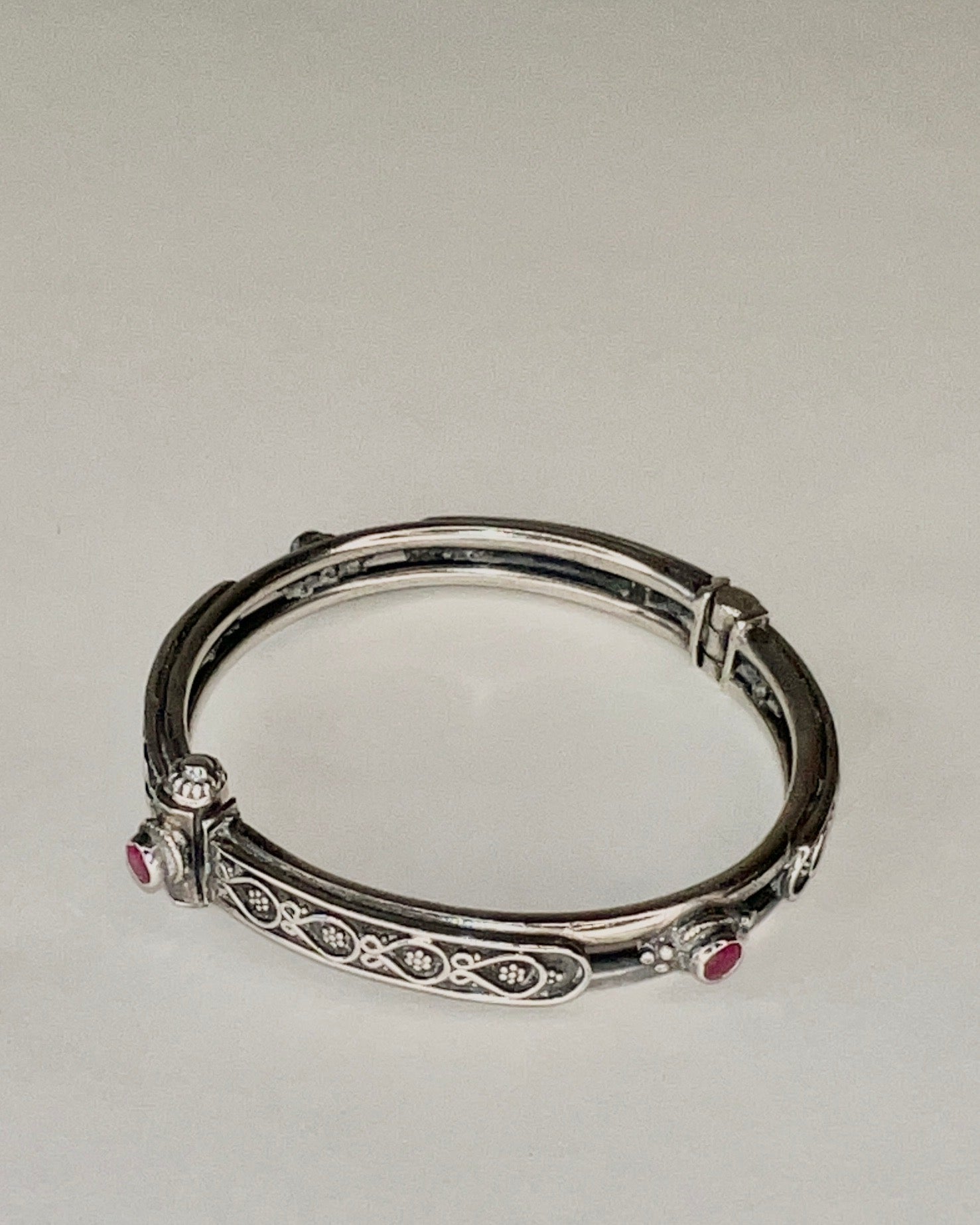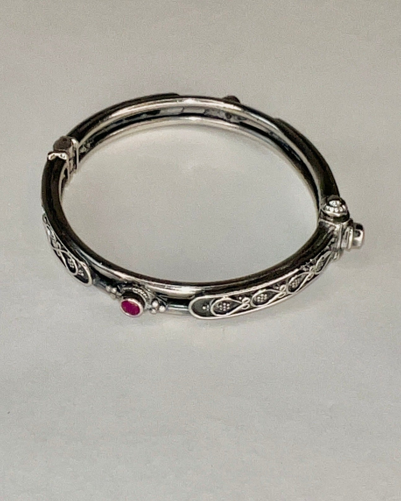 vintage silver hinged bangle with floral design, three rubies, and pin closure. Found in Chandni Chowk Market, New Delhi.