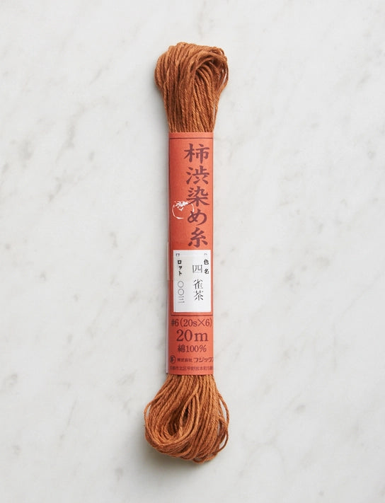 These very special hand sewing threads are hand dyed in a traditional persimmon tannin. This Japanese technique is over 1000 years old and creates incredibly gorgeous wood tones that gradually change over time (especially if exposed to direct sunlight). Use these very special Tannin Hand Dyed Threads for all kinds of embroidery, including beautiful Sashiko. To care for your finished project, avoid water with a lot of iron in it, alkaline detergents, and bleach. In the case of accidental exposure, you can restore most of the original color by soaking in water diluted with vinegar or reconstituted lemon juice.
