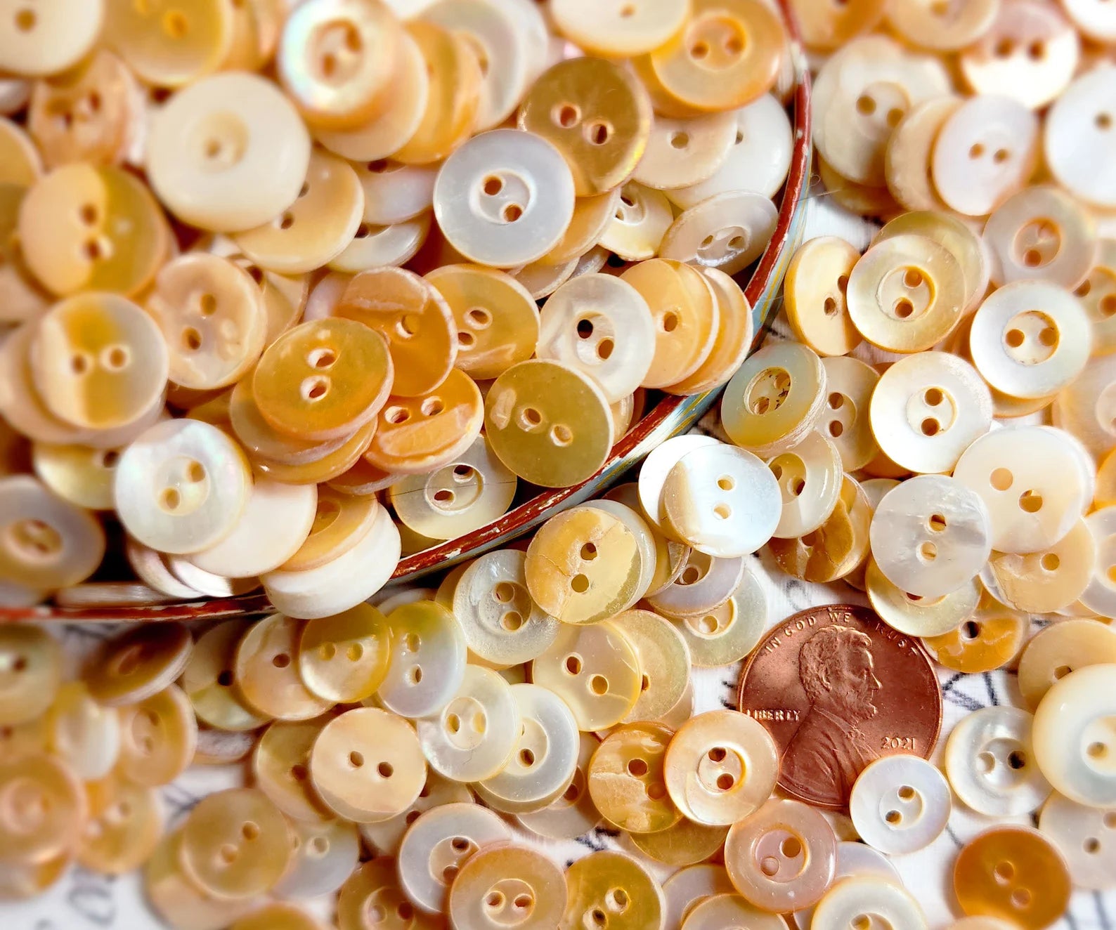 Vintage mother of pearl shell sewing buttons. Beautiful mixed shades of warm golden honey creams. All are two hole and have been gently cleaned. From a button manufacturer that closed its doors in the 1940s. Plenty enough for lots of sewing and craft projects.