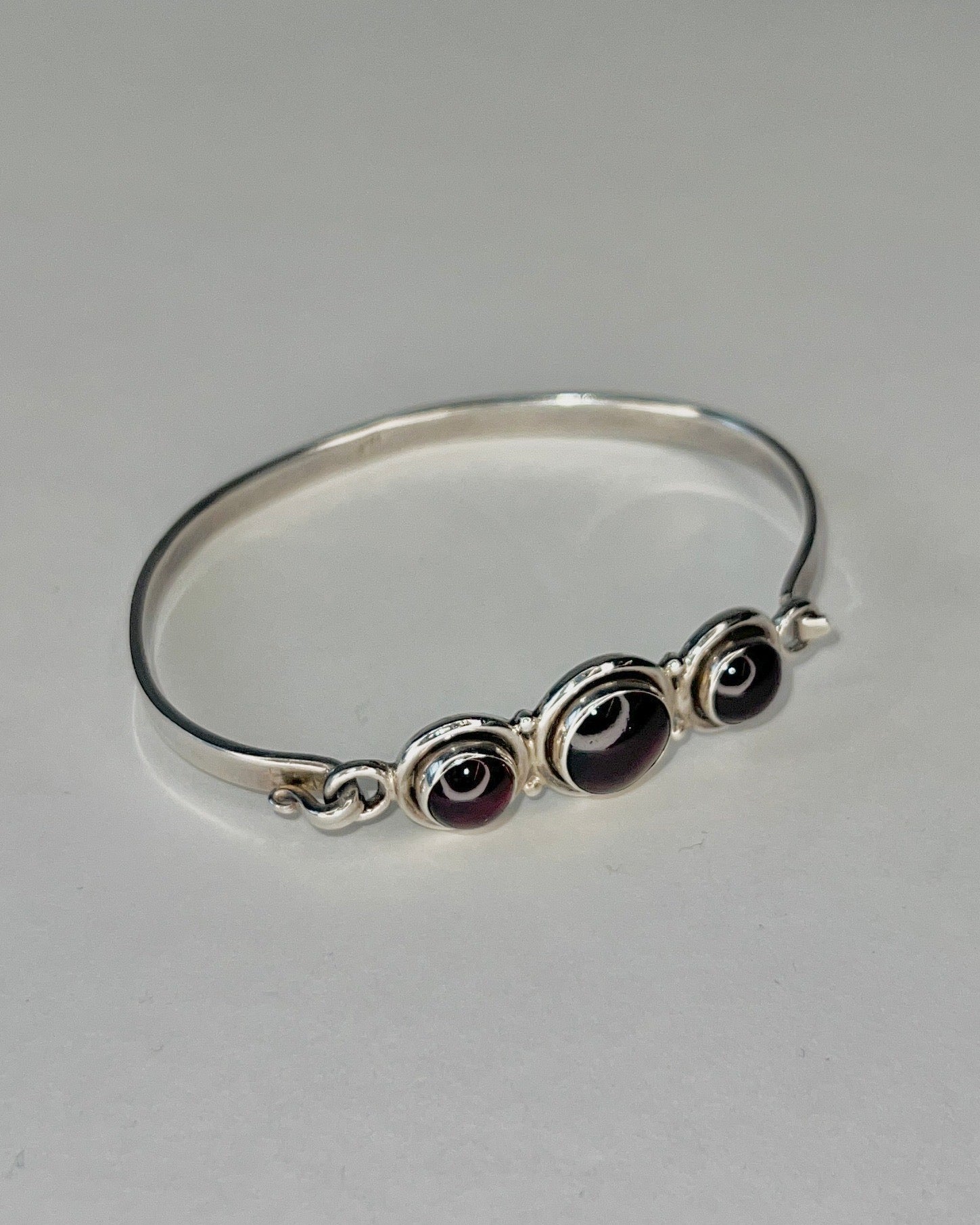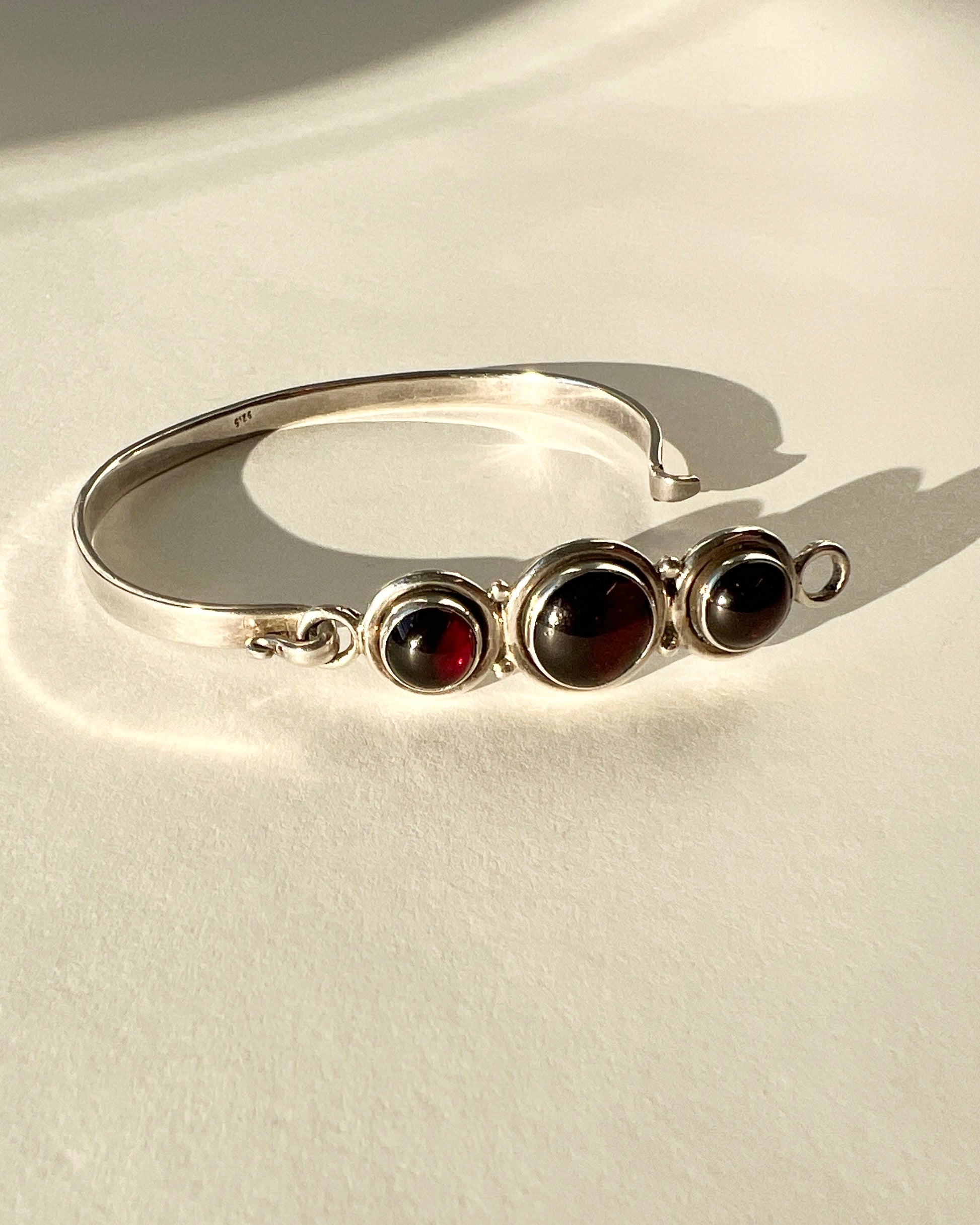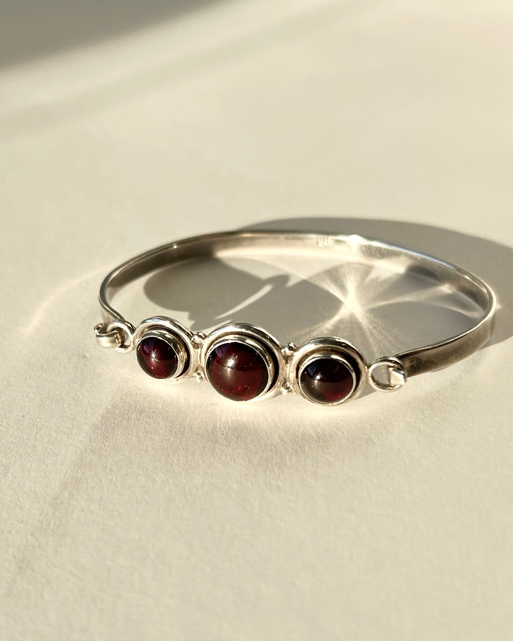 vintage silver hinged bangle with three garnet cabochons, and latch closure. Found in Chandni Chowk Market, New Delhi.