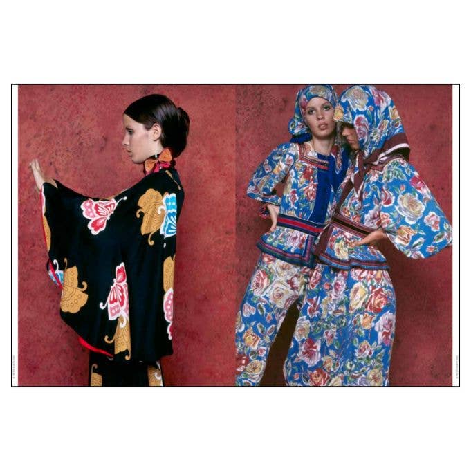 In 1970, the young Japanese designer Kenzo Takada opened his first boutique, Jungle Jap, in Paris and revolutionized the fashion world. His colorful, ethnic, and nomadic- influenced collections, made with luxurious and vibrantly patterned textiles, tweaked the conventions of haute couture while maintaining the quality of traditional European clothing houses. He was influenced by Parisian fashion and Japanese kimonos, boldly mixing colors and prints, cuts and materials. His vibrant palette and pattern combinations were joyful and whimsical, and very different from the subtle tailoring of the traditional Paris couturier. In his inspired blend of the opulent and the exotic, he developed a signature style and found early success.