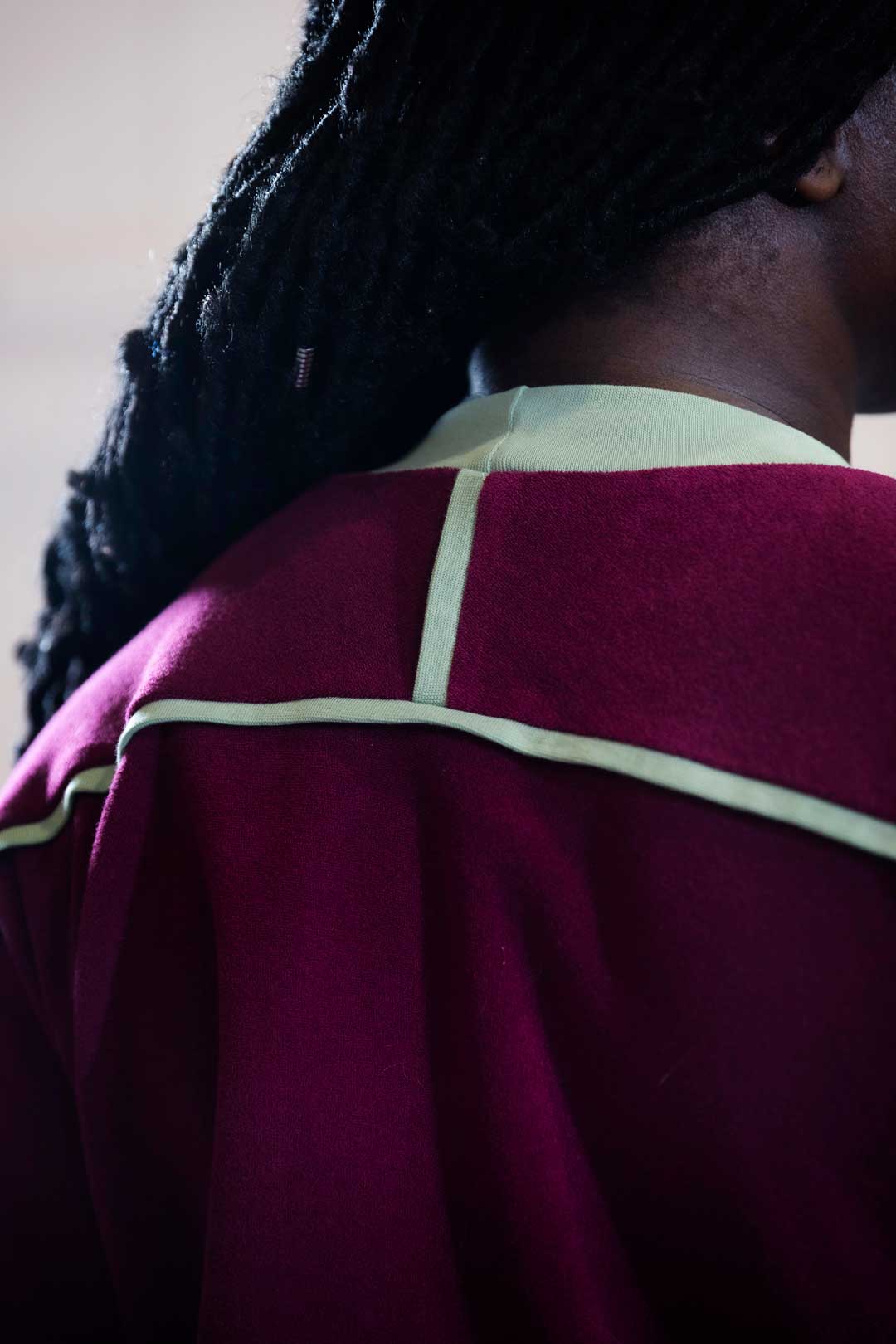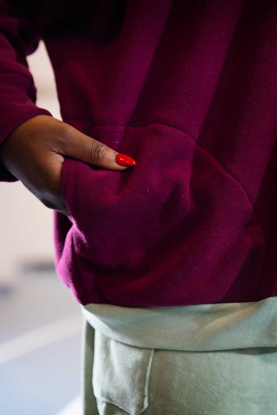 Choose medium to heavy-weight knits or jerseys for sporty and activewear versions. Use plush fabric for greater comfort and warmth. To create a casual look, choose a medium-weight linen. Choose double gauze for a cosy feel and draping fabrics such as silk or Tencel for an elegant look. The green sample is made in “Unbrushed Organic Cotton Sweat” in shades of green (100% organic cotton, 9.73 oz/330 gsm) and the purple sample is made in “Brushed Terry GOTS Organic Cotton Purple Potion” (100% organic cotton, 8.55 oz/290 gsm). The neckline rib and the bias binding are made using “Rib 1x1 stretch GOTS Organic Cotton”. All fabrics by Ecological Textiles.