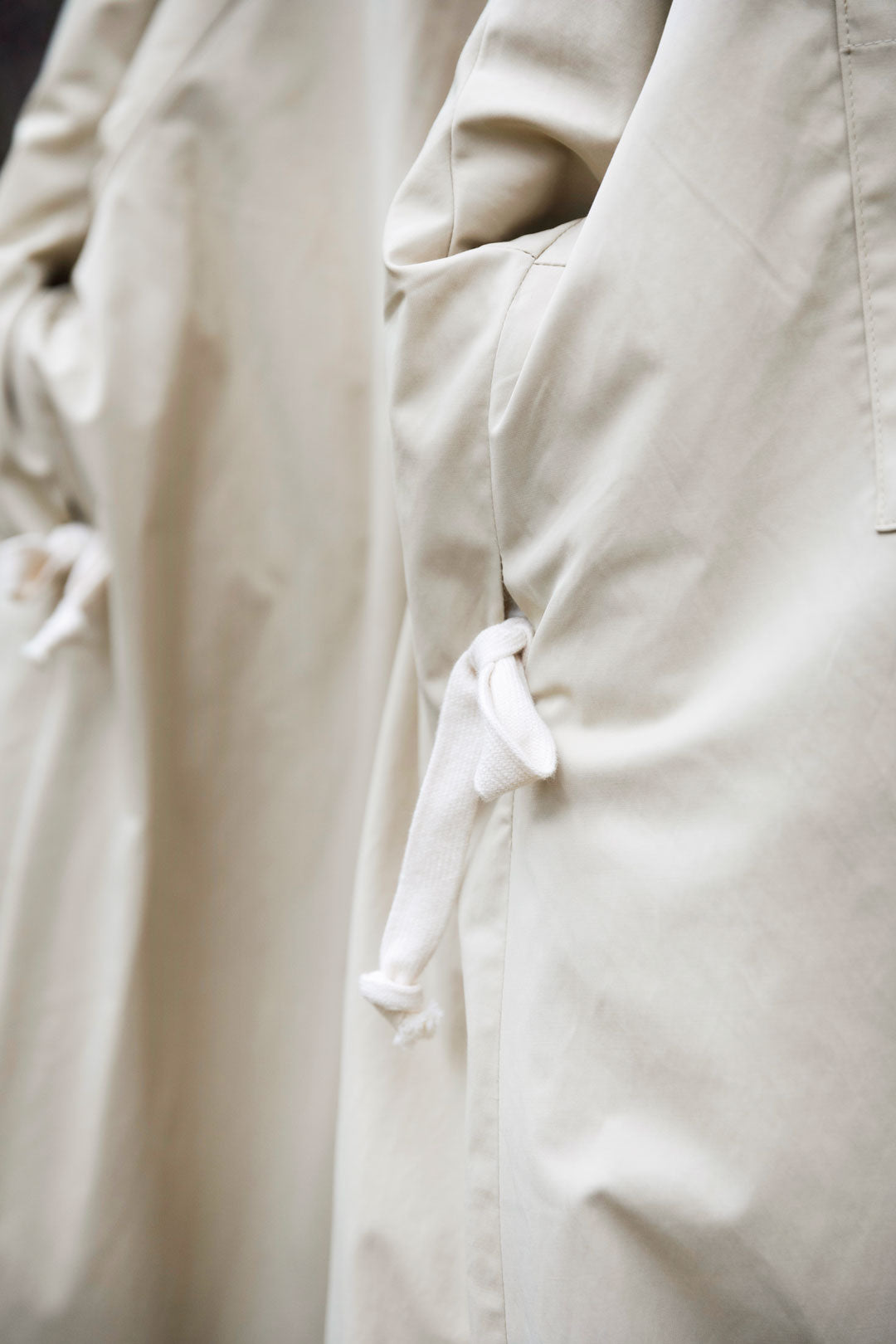 The sample coat is made in “Leafly Bold Bottle Green Canvas” (100% cotton, 11.80 oz/400 gsm) by METERMETER. The wool fleece batting (85% new wool, 15% polyester, 5.3 oz/180 gsm) is by Ecological Textiles and the lining is from the designer’s stash. For the coat drawstring, we used 0.6"/1.5 cm wide natural tubular ribbon (100% organic cotton) by Ecological Textiles. The jacket version is made in dark green water-repellent canvas (100% organic cotton, 8.9 oz/300 gsm) by Ecological Textiles. The zippers are by METERMETER.