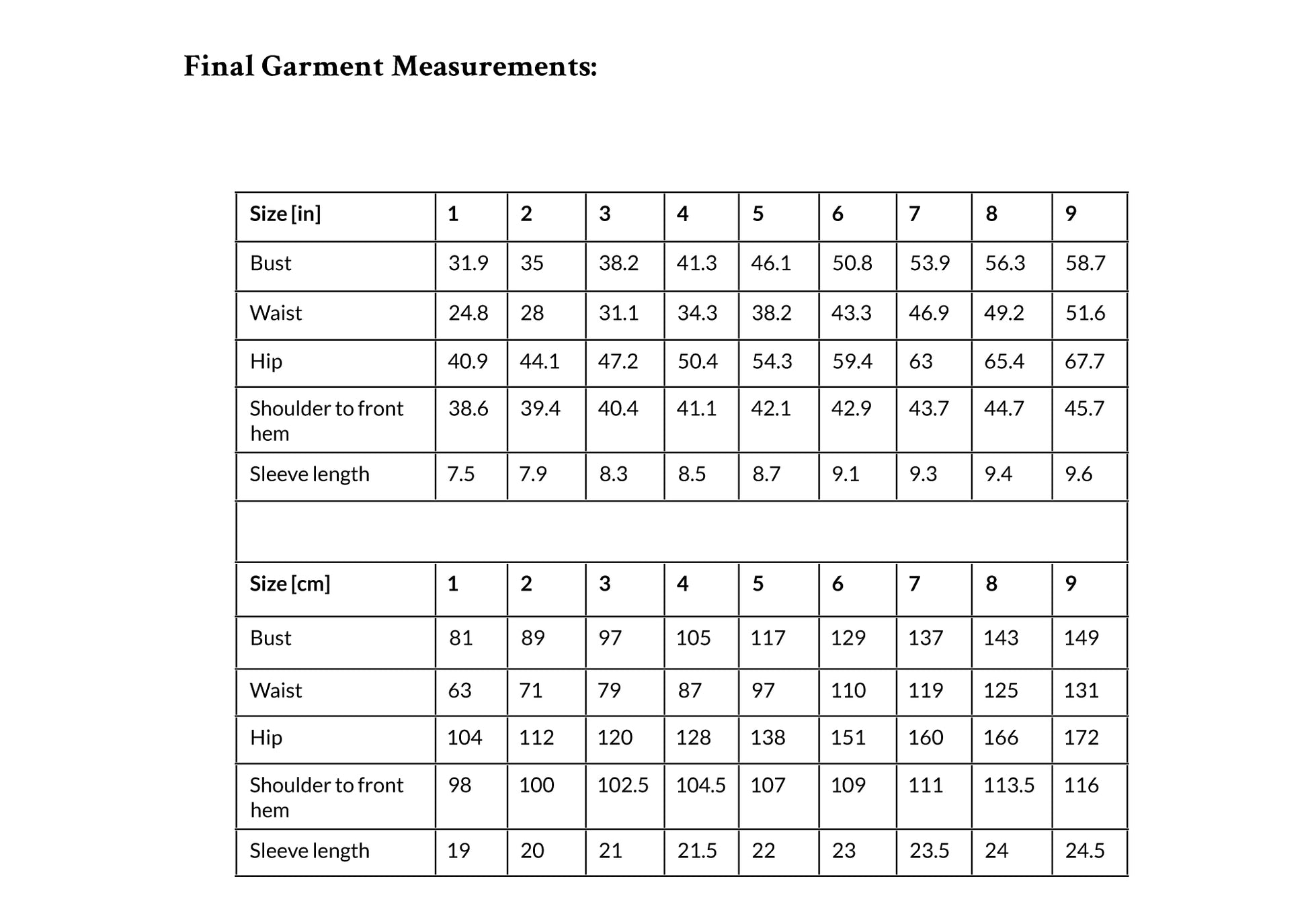 Choose your size based on your bust and waist circumference. Add a recommended positive ease of 1–2"/2.5–5 cm. Pick the size that is the best match for your bust and waist.