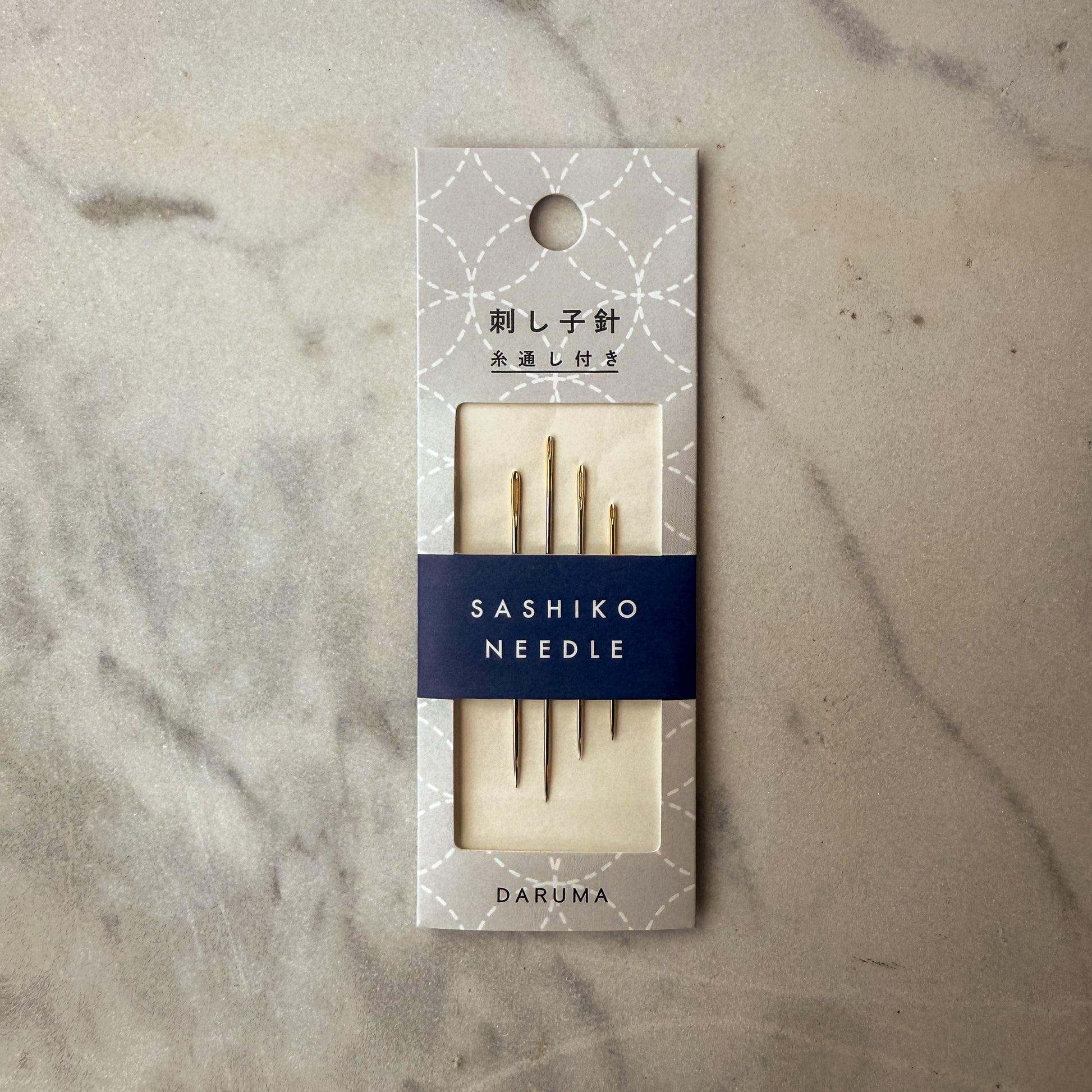 Four classic sashiko needles, two shaft thicknesses, one threader—ready for anything from fine linen to layered cottons. Sharp, durable, made in Japan.