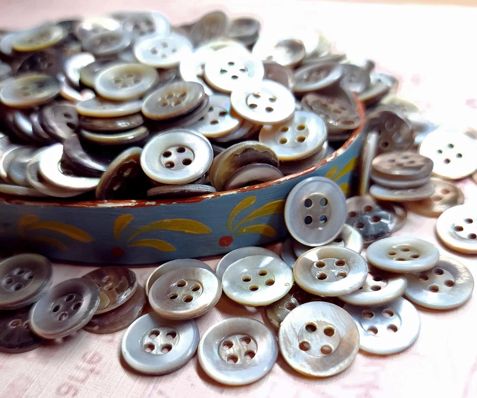 Wonderful smoky gray oyster shell mother of pearl shell buttons with a simple broad flat rim design. These are new old stock (NOS) from a button factory that closed in the 1940s. In deep storage ever since they were quite soiled when we received them, so we've gently cleaned and polished them (no chemical or oils).