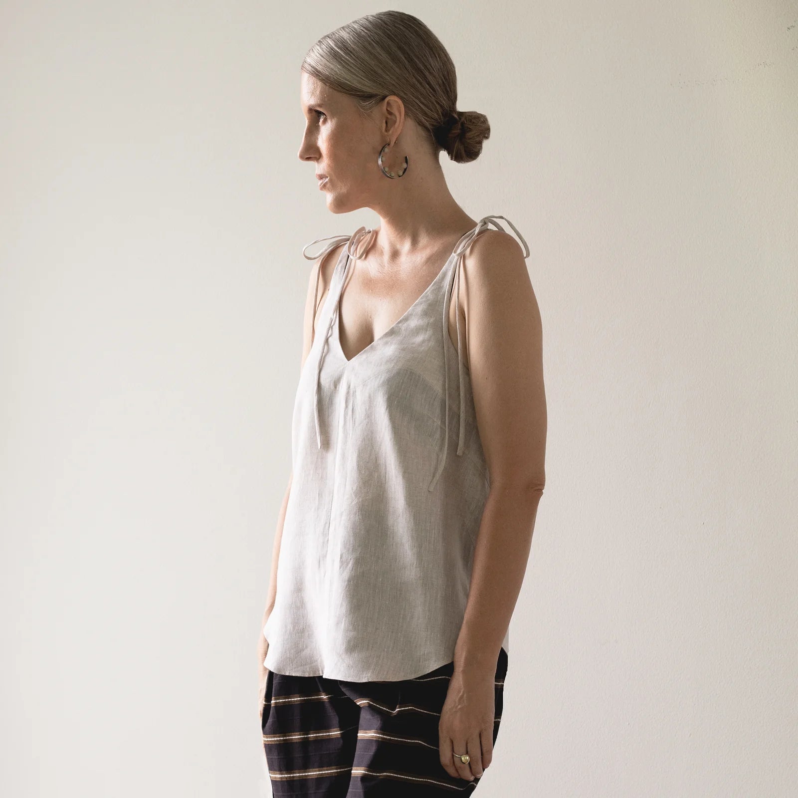 The Teia (Tey-A) dress & cami is a loose shift that can be worn as a simple dress or pinafore over a blouse. Utilitarian finishes include deep facings, mitred cornered hems and side splits. Topstitching to enhance the style lines. Optional pockets and striking long stretched out straps for a vampy finish on an otherwise easy wearing dress.