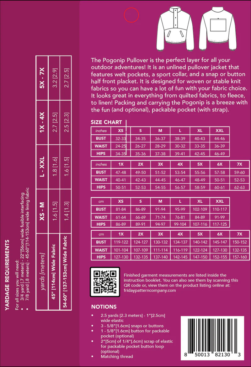 The Pogonip Pullover is the perfect layer for all your outdoor adventures! It is an unlined pullover jacket that features welt pockets, a sport collar, and a snap or button half front placket. It is designed for woven or stable knit fabrics so you can have a lot of fun with your fabric choice. It looks great in everything from quilted fabrics, to fleece, to linen! Packing and carrying the Pogonip is a breeze with the fun (and optional), packable pocket (with strap).