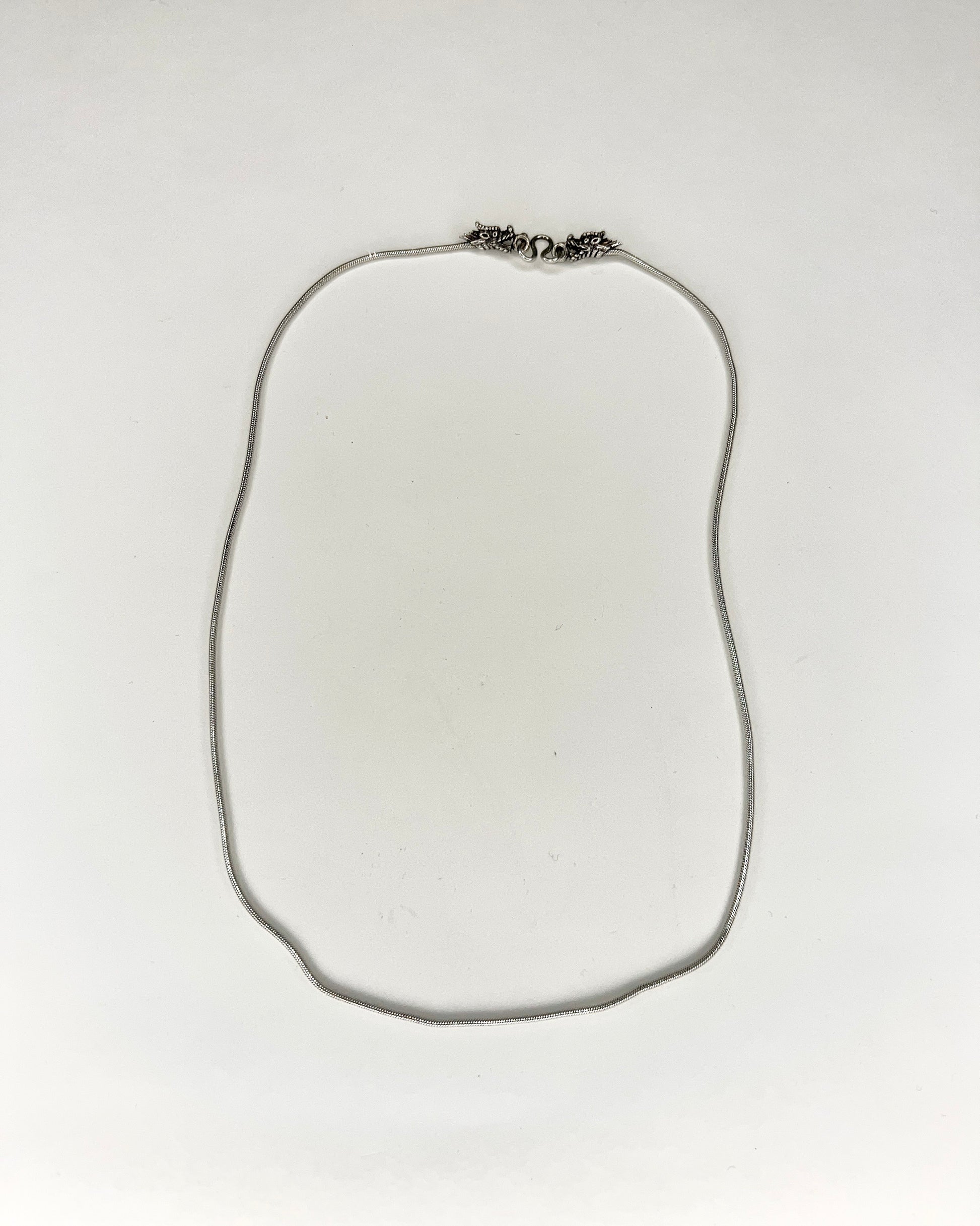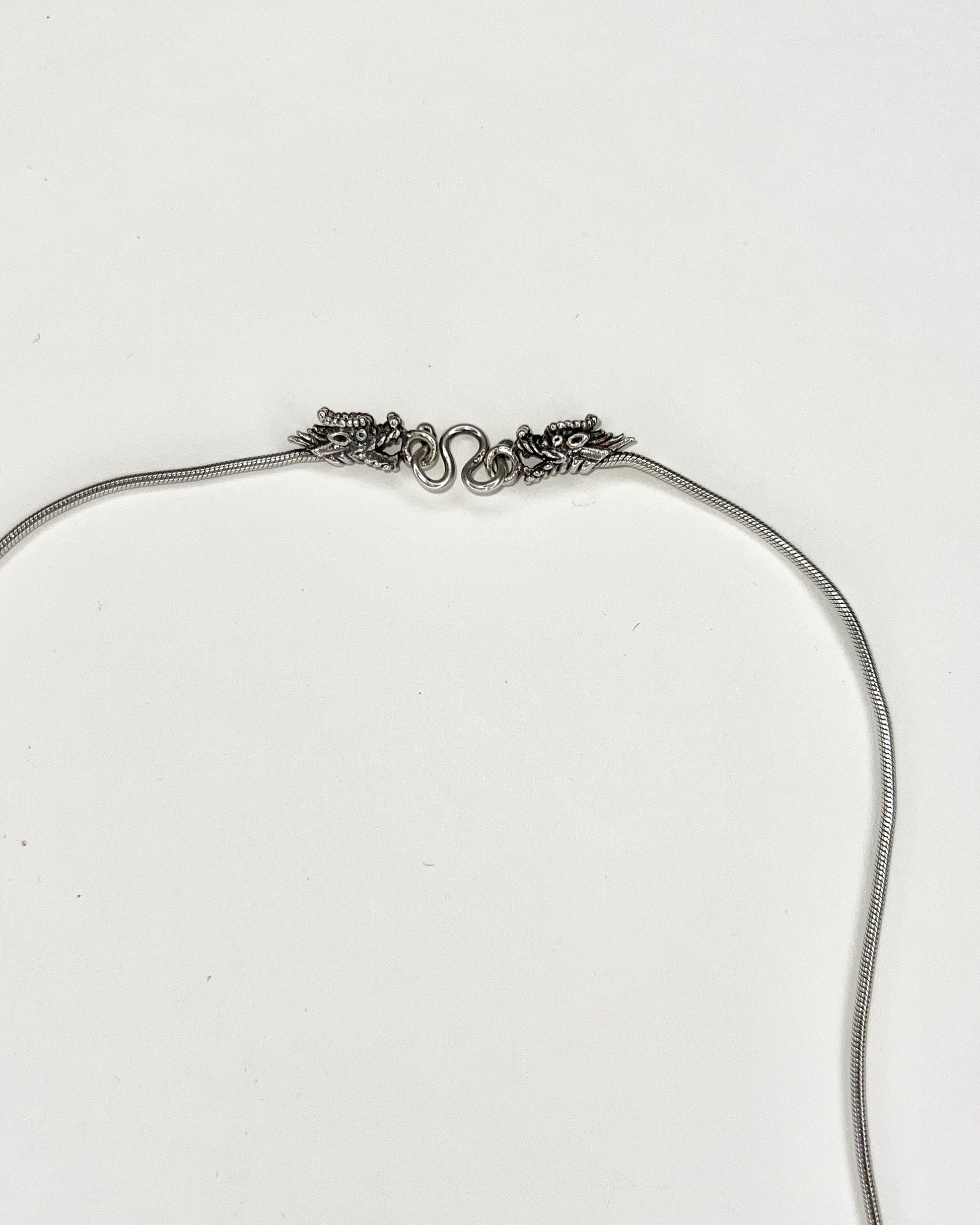 Vintage silver round chain necklace with cast dragon closure, from Chandni Chowk Silver Market in New Delhi.
