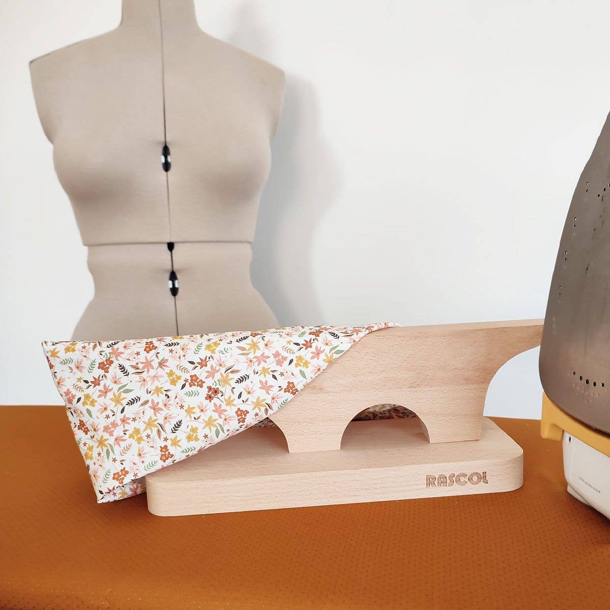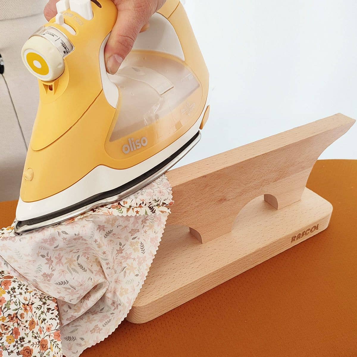 Use the pointed handle (the tailor point press) to press on the relief of seams such as collars, spikes, and narrow, hard-to-reach corners. Place the wedge to be pressed in an open seam on the dish with the tip inside and use a steam iron to crush the seam. Turn the corner and repeat the process to create a perfect spot.